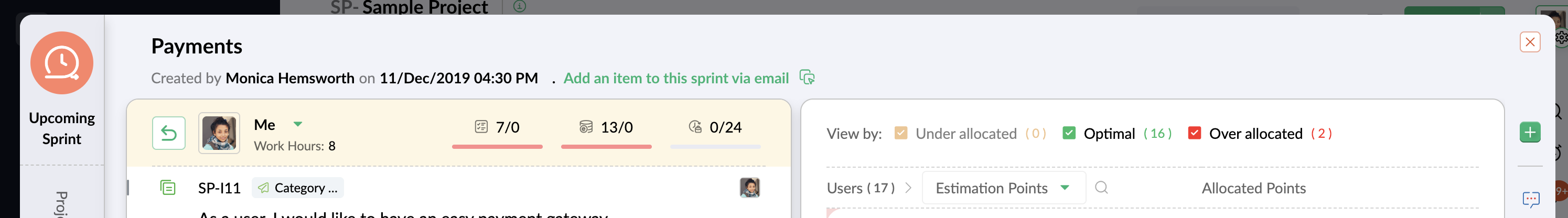 - By Work Items: The system refers to the average velocity of the user from the previous sprints and determines the actual capacity of the user for the current sprint.