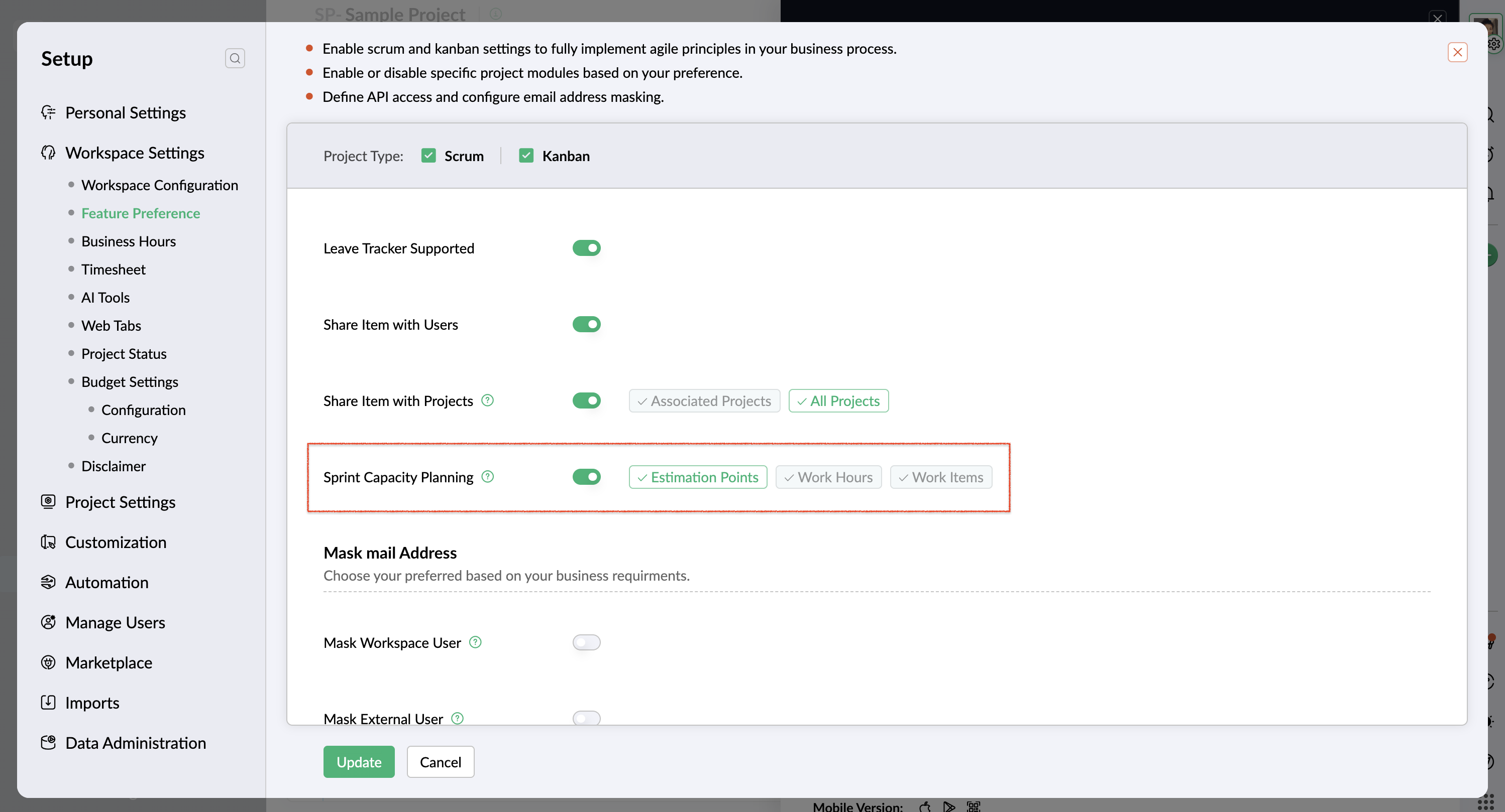 You can select any of these methods to be your default capacity planning method in the Sprint.
