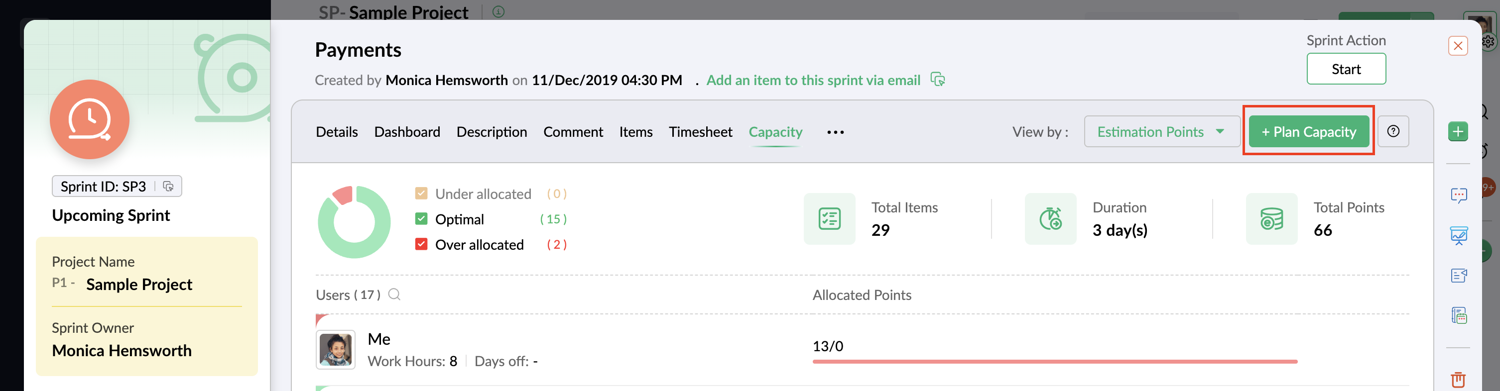 All users of this sprint will be listed along with their capacity details. - Click +Plan Capacity if you want to make changes to the allocation. =