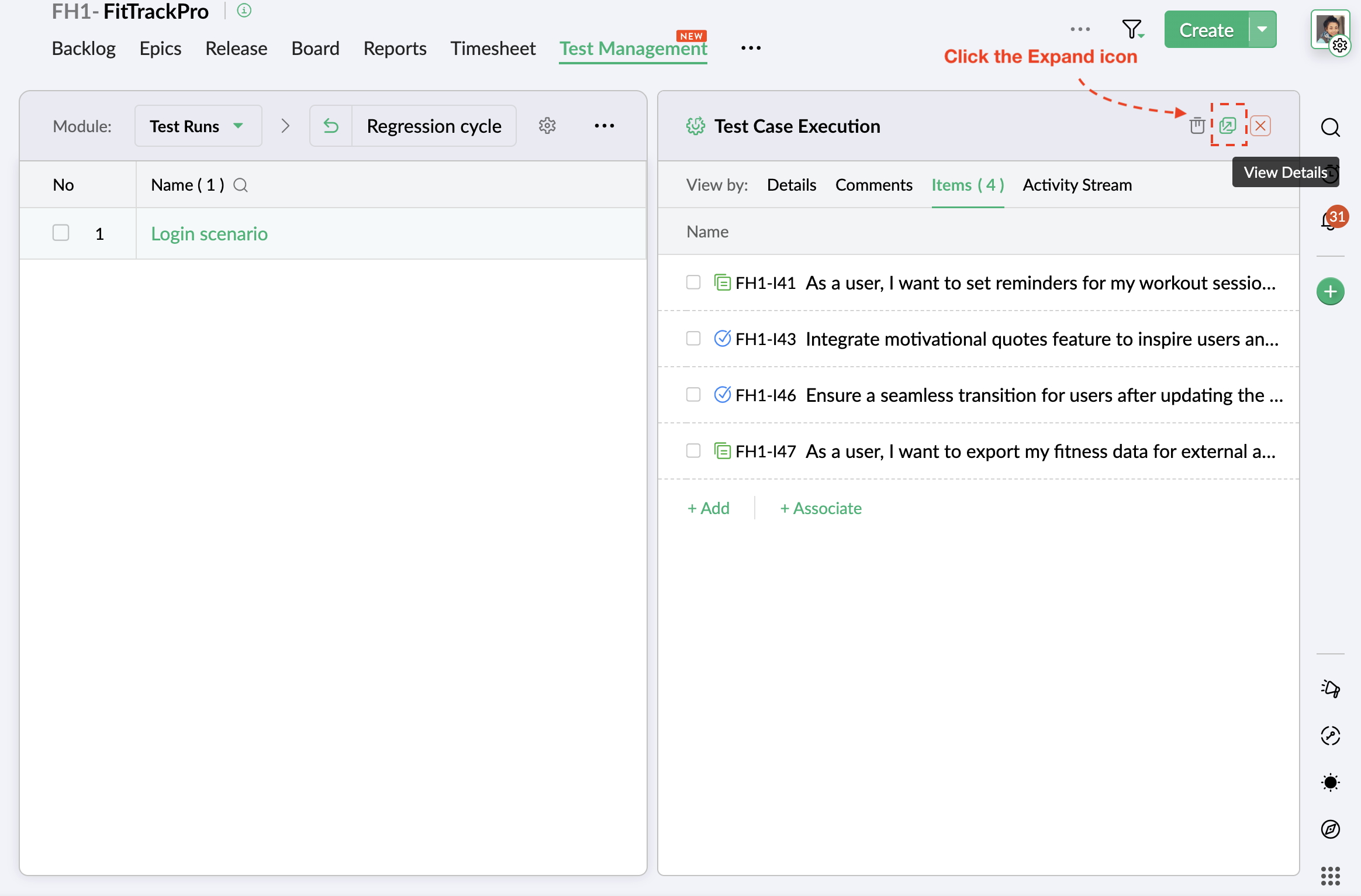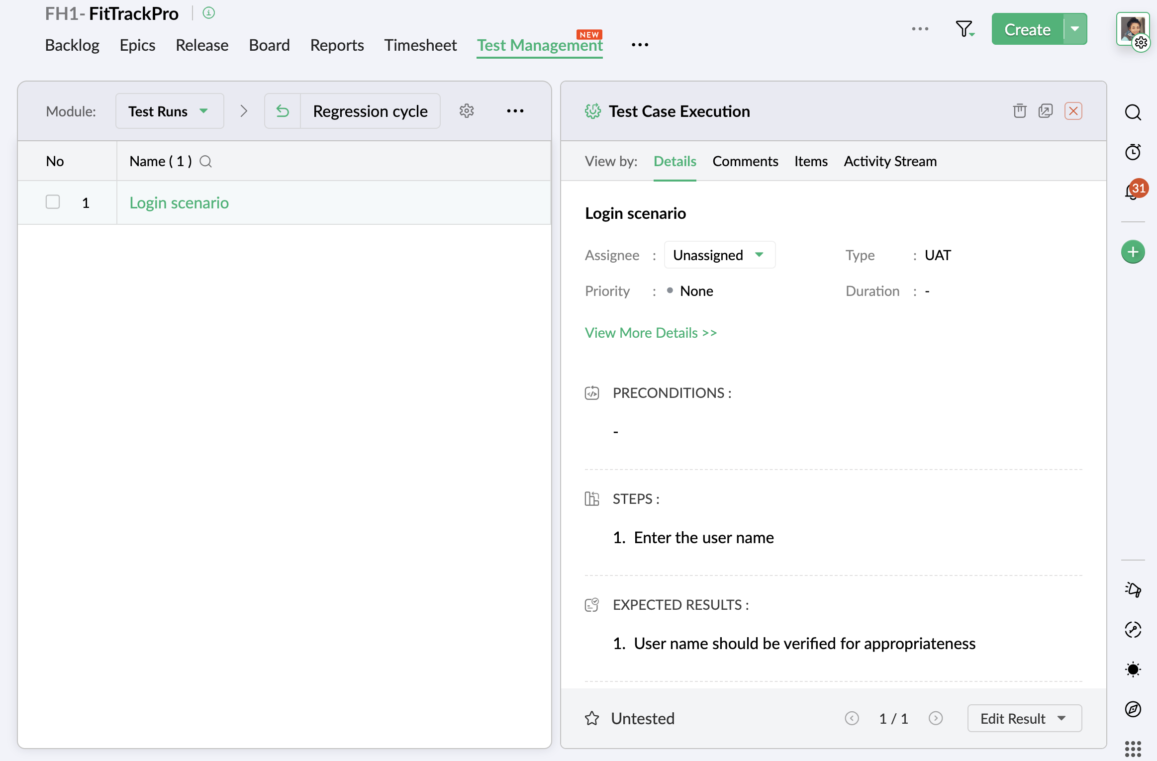 - View the test case details such as Preconditions, Steps, and its Expected results.