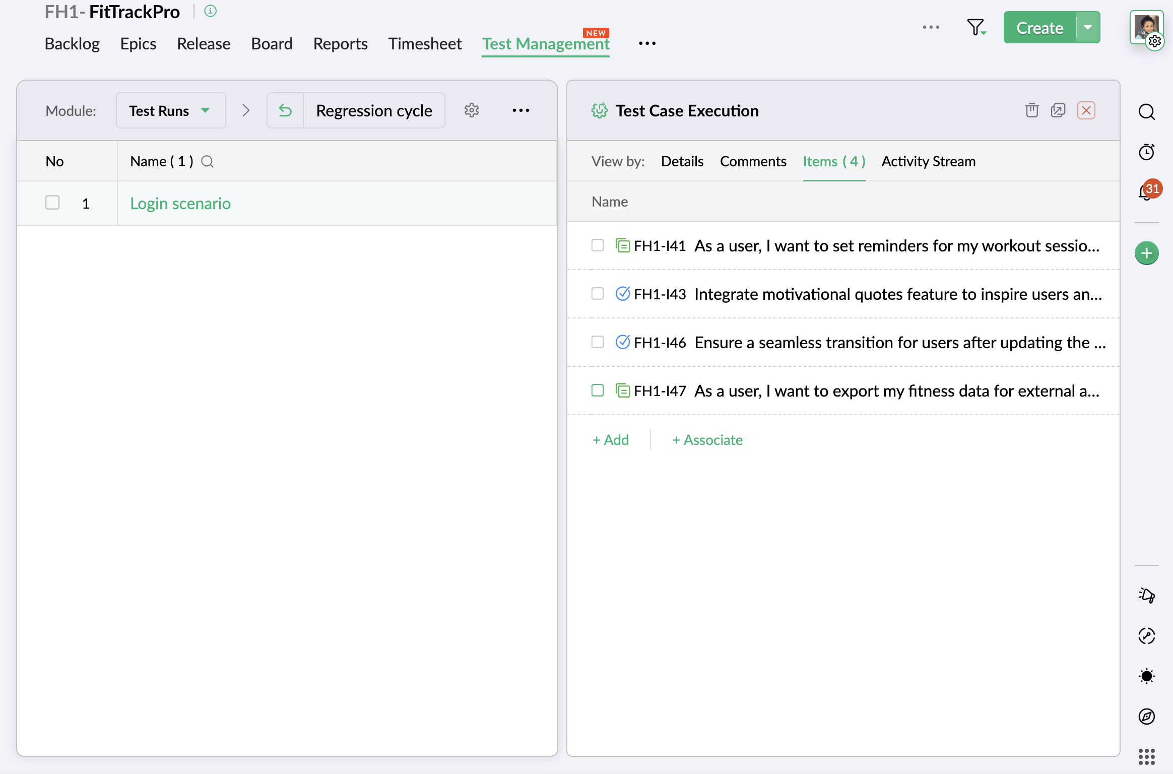 - Add or associate items to the test case from within the Items tab, in case the test case fails the expected result or needs to fulfil a requirement, or so on.