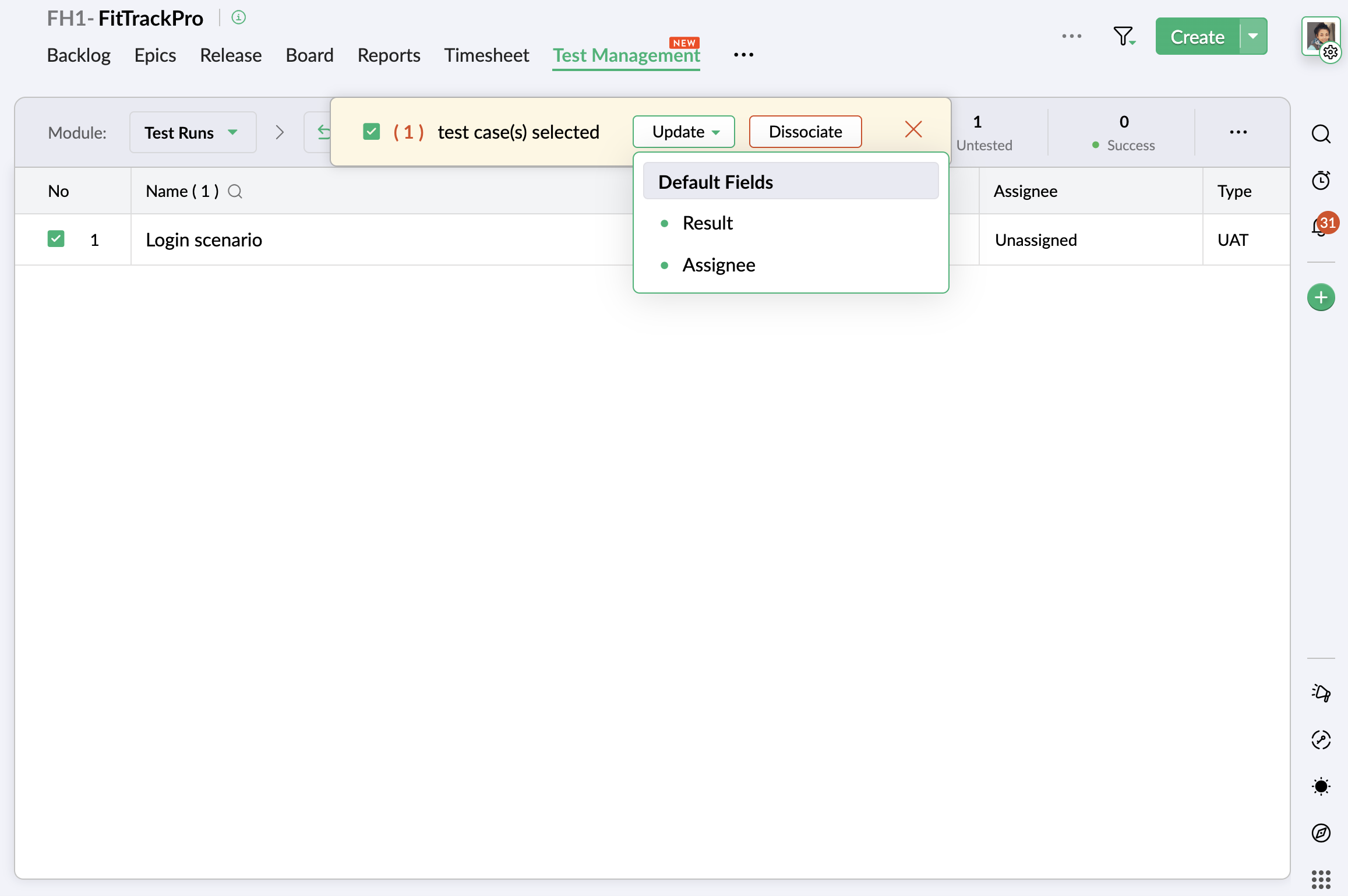 You can select multiple test cases within a test run to update their assignee and result fields, or to dissociate them from the test run.