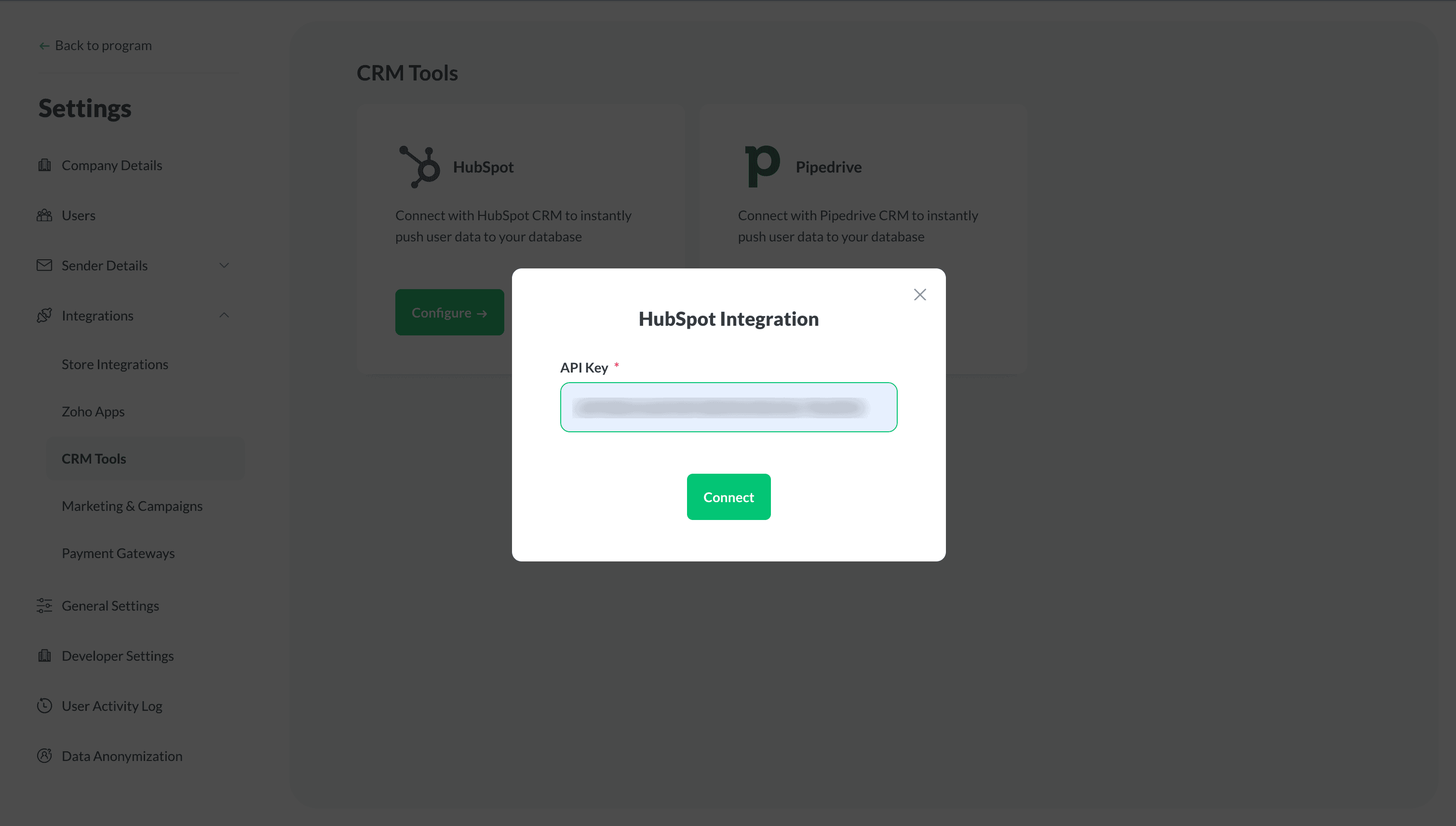 Once the toggle is enabled, all your program user data will be pushed to the Pipedrive CRM automatically. Disabling the toggle will pause this process.