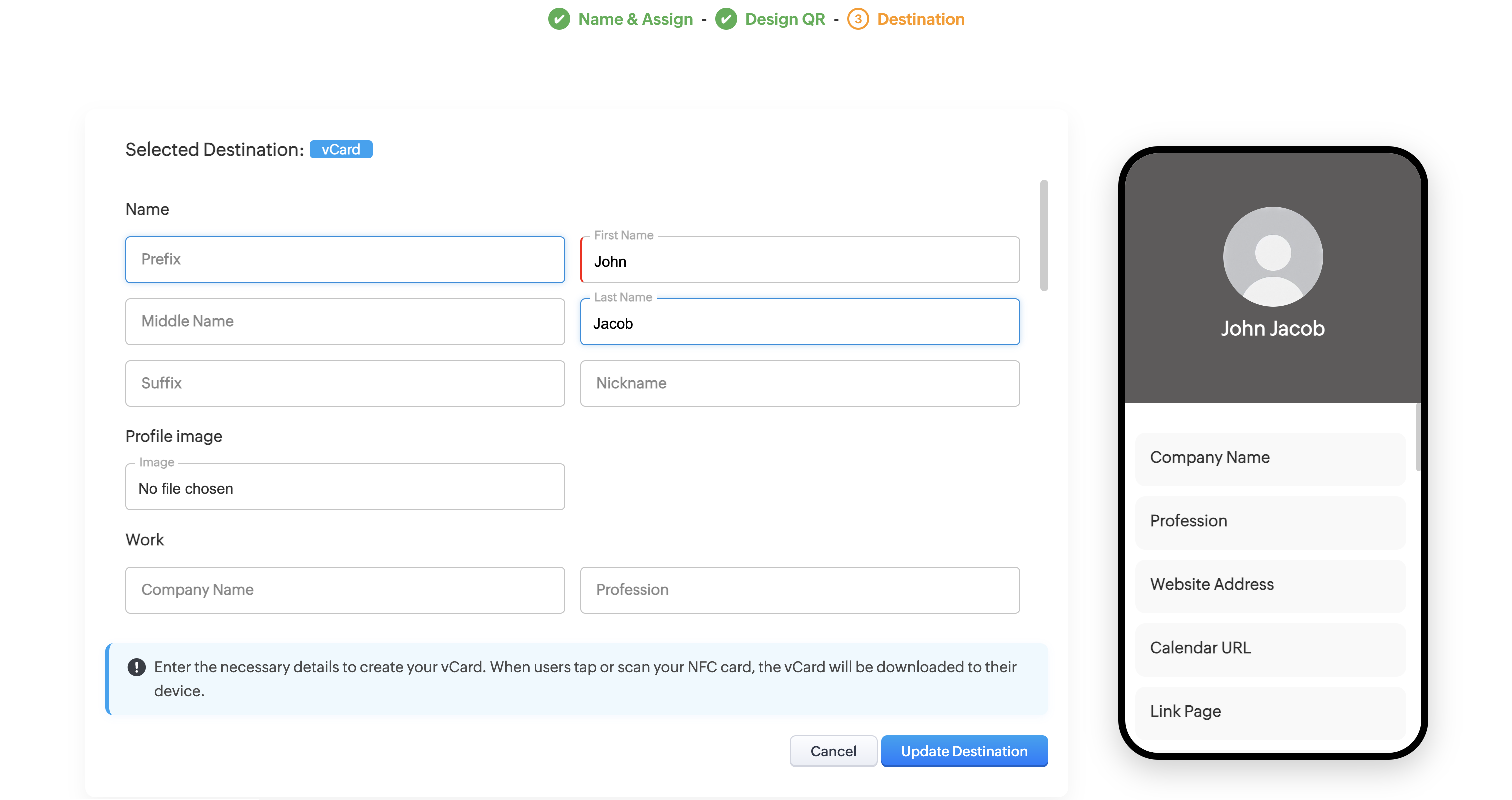 You can edit this vCard or change the destination for your NFC card any time you want. (However, your physical NFC card design will not be available for edit or re-print, once ordered.)
