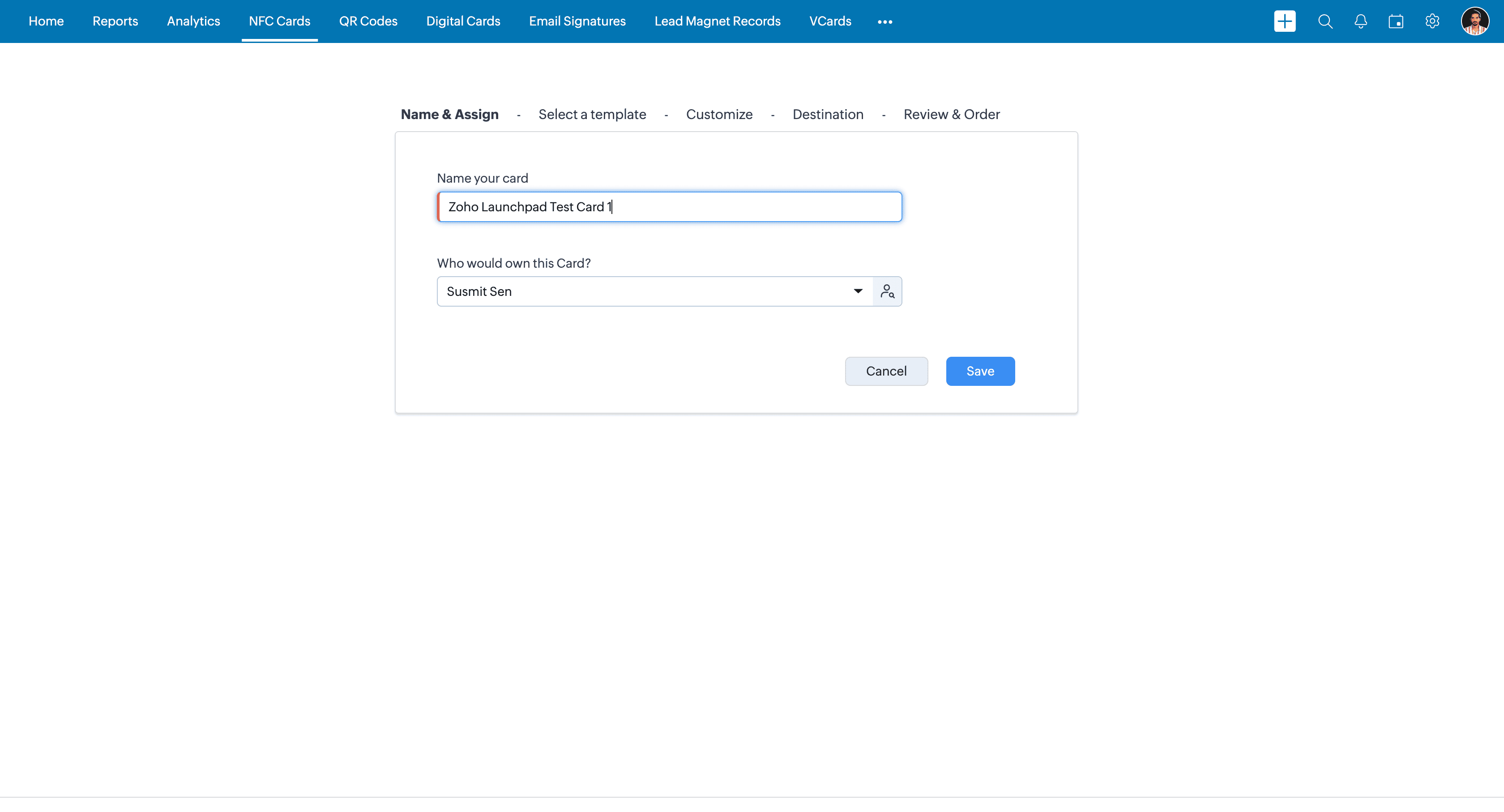 Choose the owner of the card. You can assign it to yourself or any member of your organization