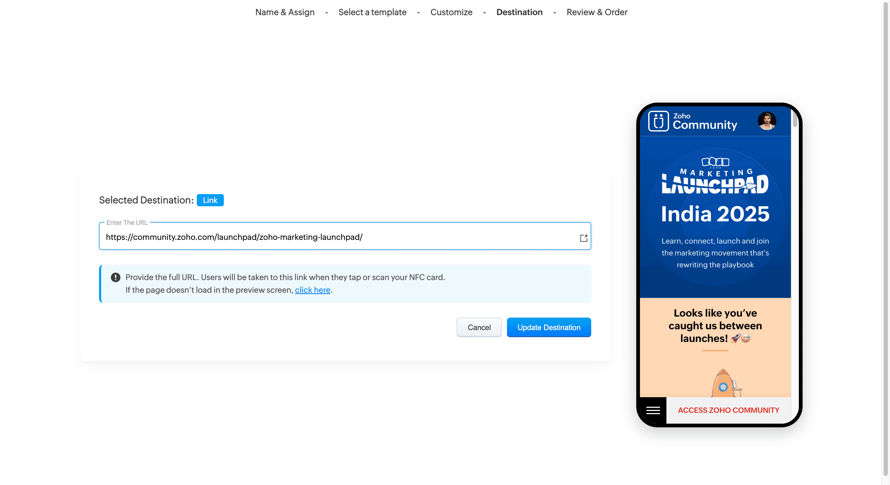 Although the physical design of the NFC card cannot be changed after printing, you can freely update the destination linked to the card.