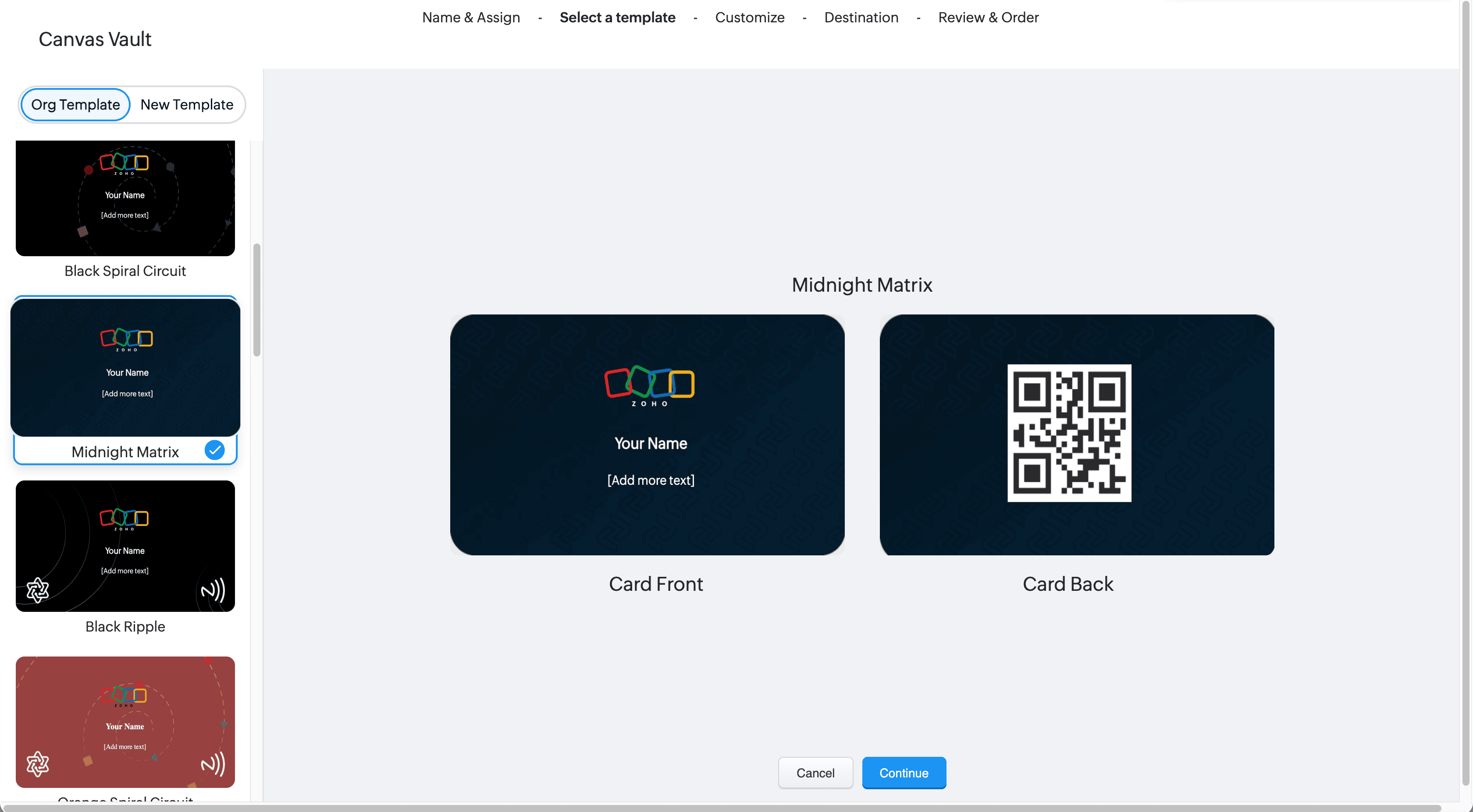 Click Org Template to browse through the available designs. Each NFC card has a front and a back side. You can customize both.