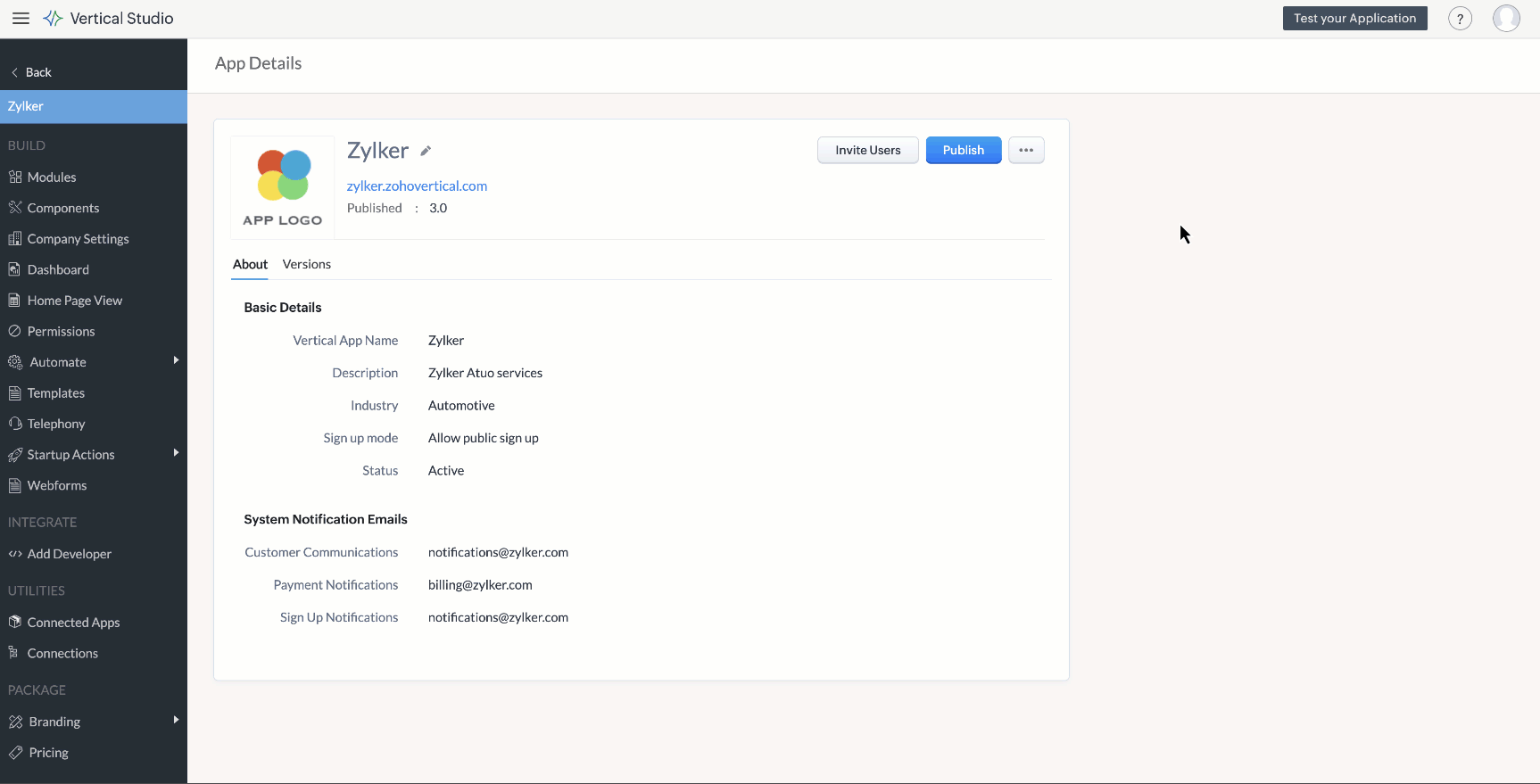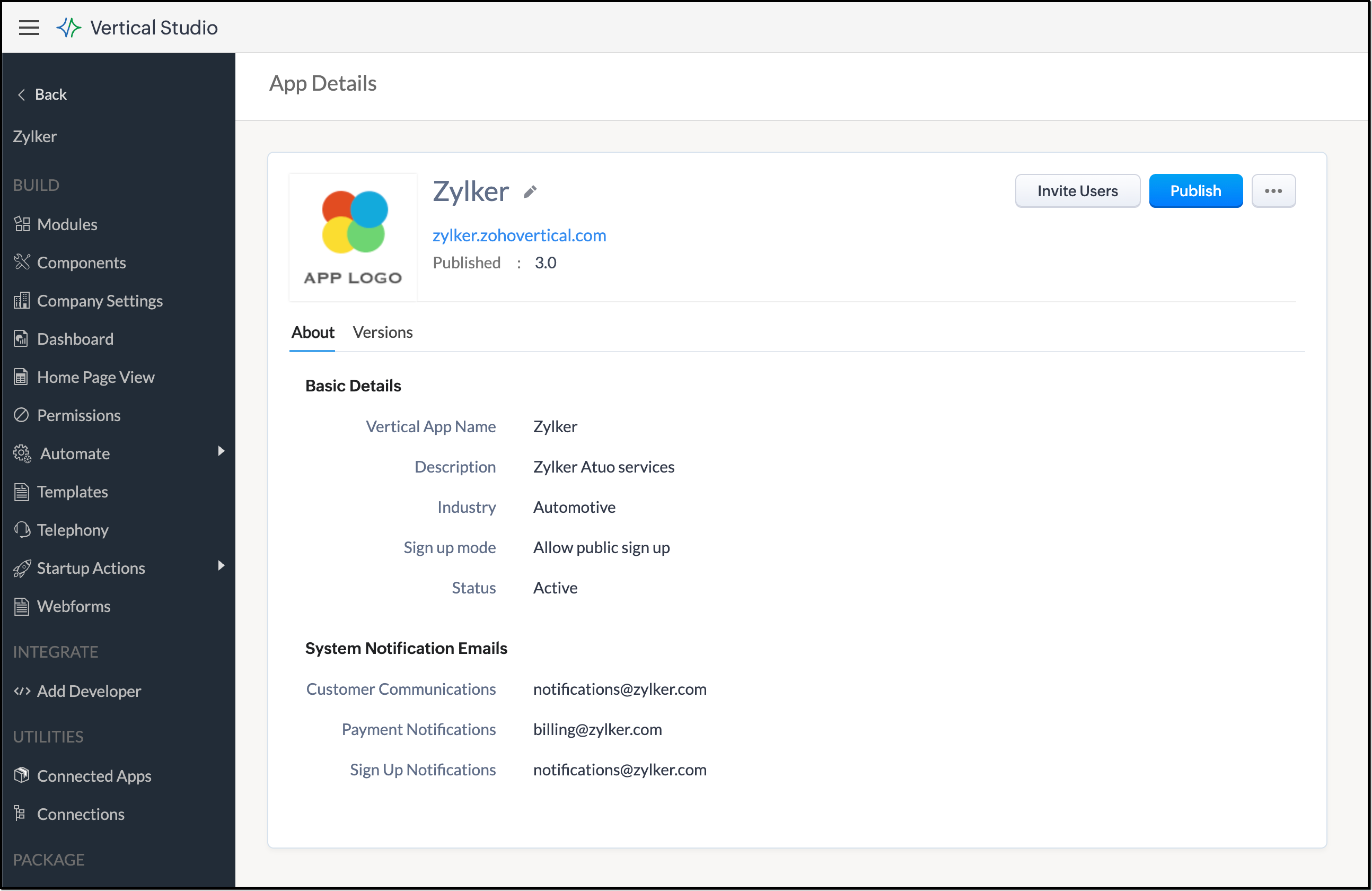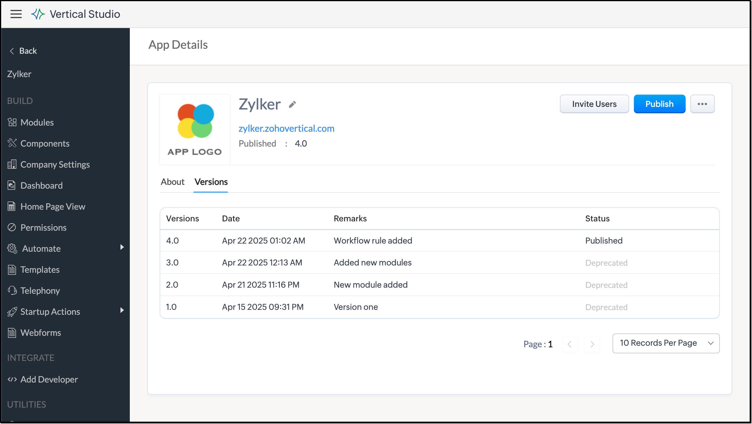 This tab logs the publishing history of the application. It allows you to maintain a detailed log of significant updates for traceability. Each version entry contains: