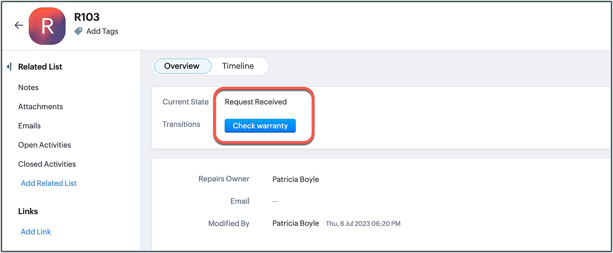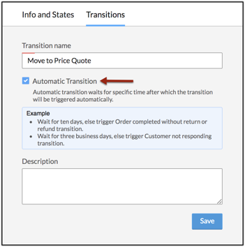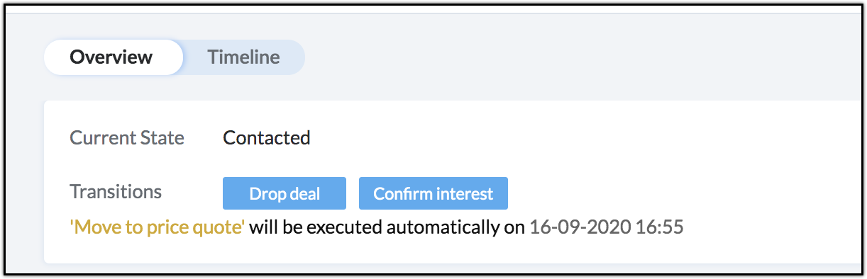 For instance, in the following screenshot, the system will wait for one of the transitions to take place: Either "Confirm Interest" or "Drop deal". If no action is taken on this record until a said date, the record will be moved to the "Price Quote" stage automatically and the users can take it up from there.