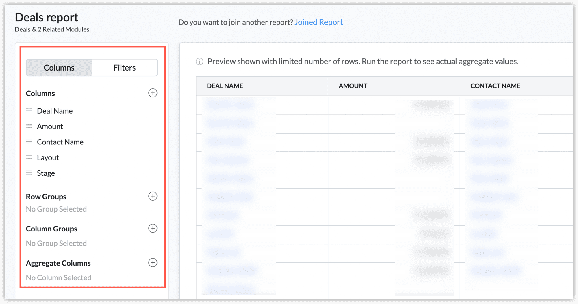 You can use the parent-child relationships between modules to add more modules to a report. For example, if you choose Deals as the primary module and then choose Activities as a child module, then you can choose from the modules which appear as related lists in the Activities module to add as another level of data.