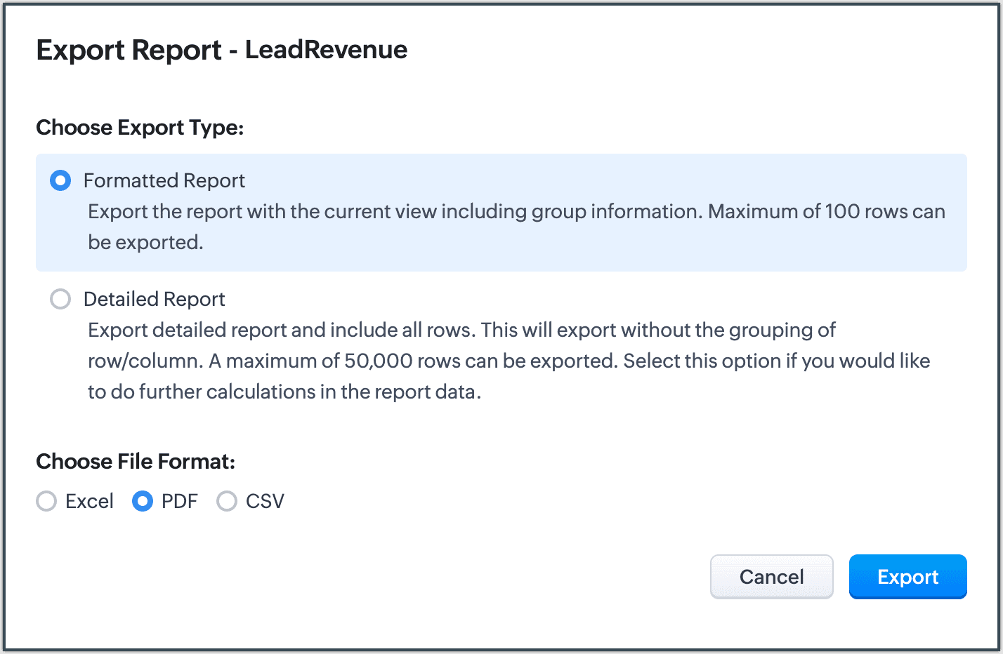 Export reports to download them in Excel, PDF, or CSV format. You can choose to export the report in either of the following types: