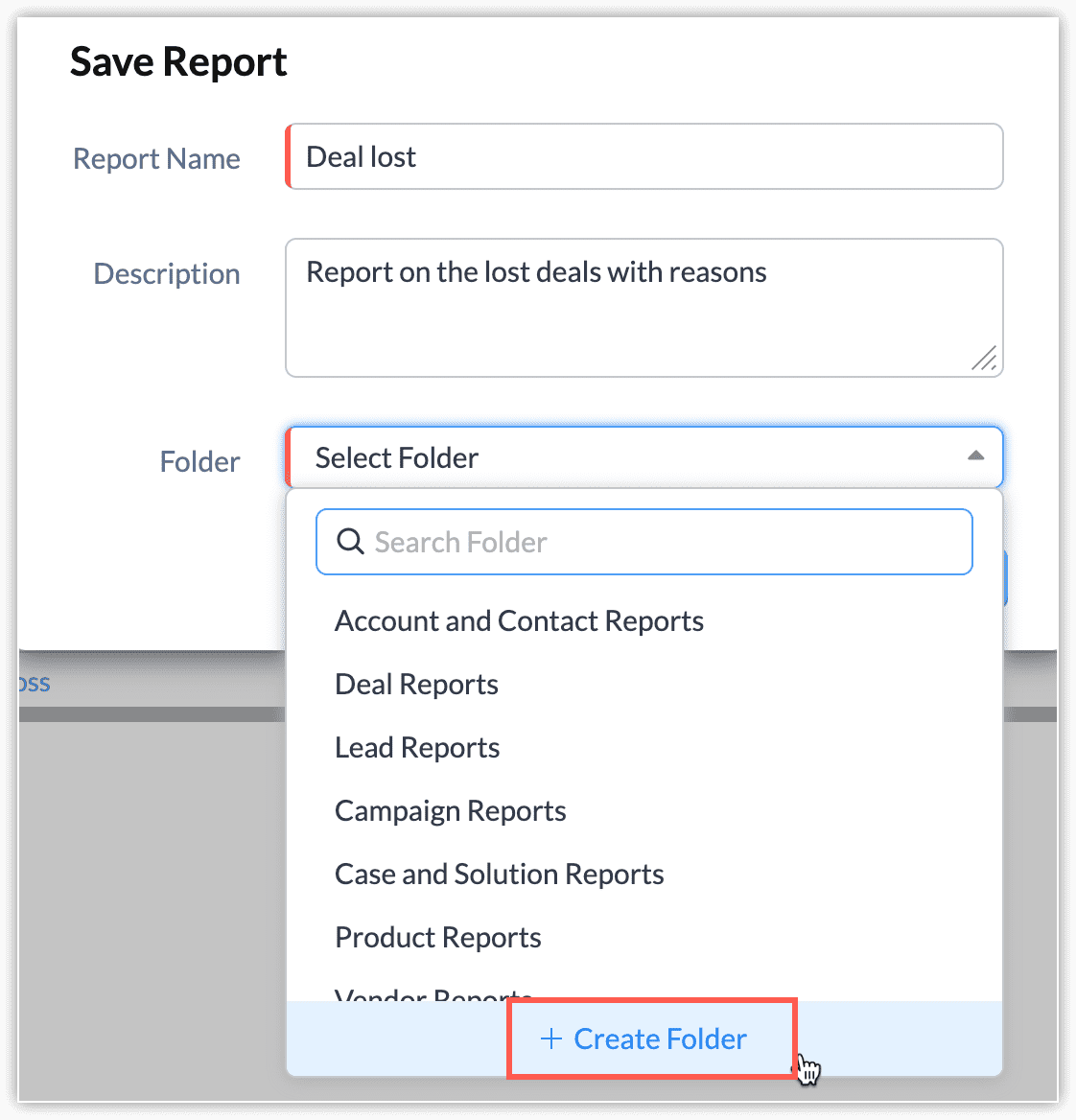 - Choose + Create Folder from the Folder dropdown on the Save Report As pop-up.