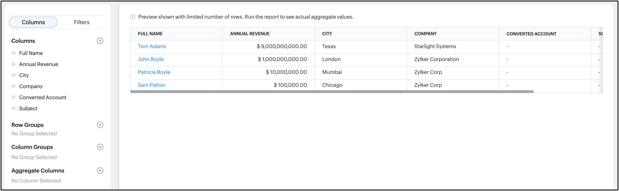 For example, you could join two reports which all have Leads as the primary module, showing data about the city, lead source, and average annual income.