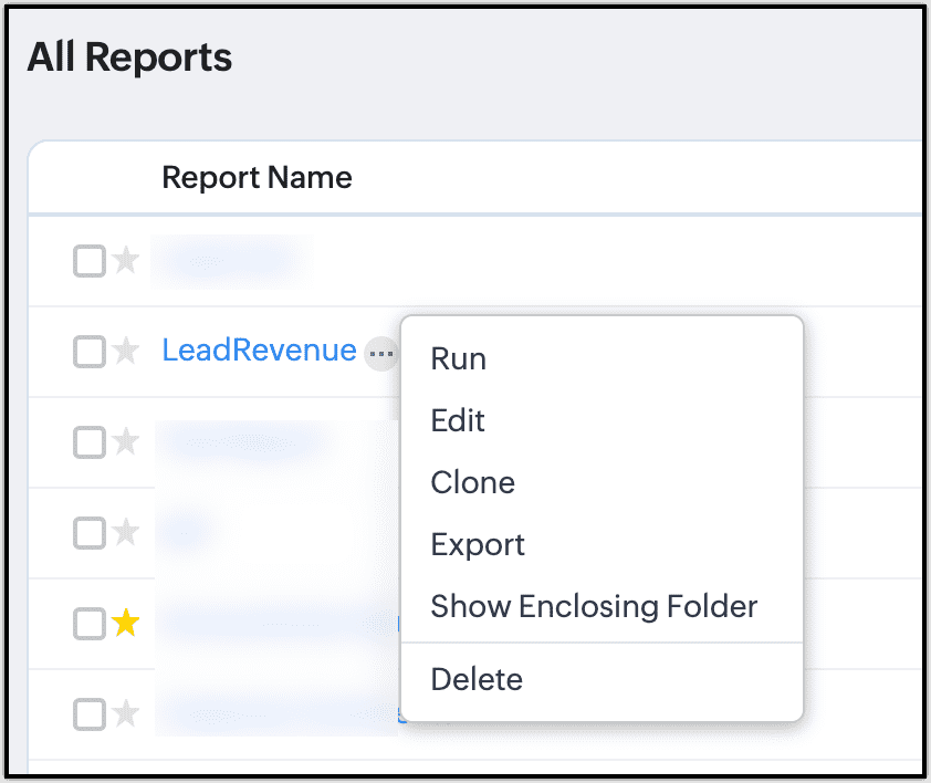 You can perform quick actions using the icon next to a report's name on the Reports list page. The Run, Edit, Clone, and Export options can also be accessed from each report.