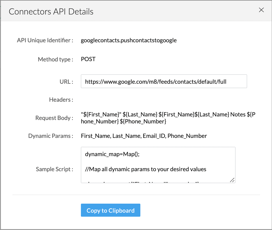 ZOHO.CRM.CONNECTOR.invokeAPI("gcontacts.pushcontact",data)
