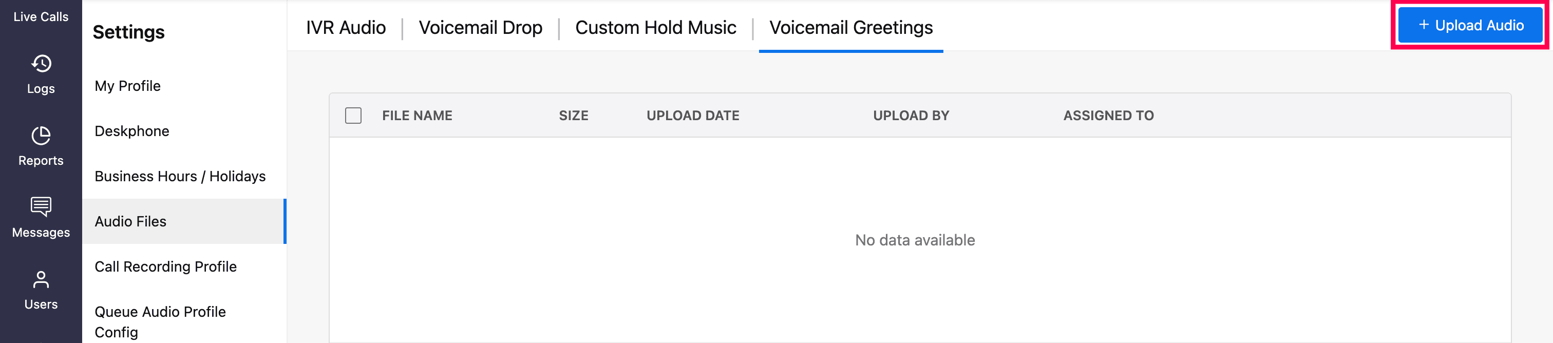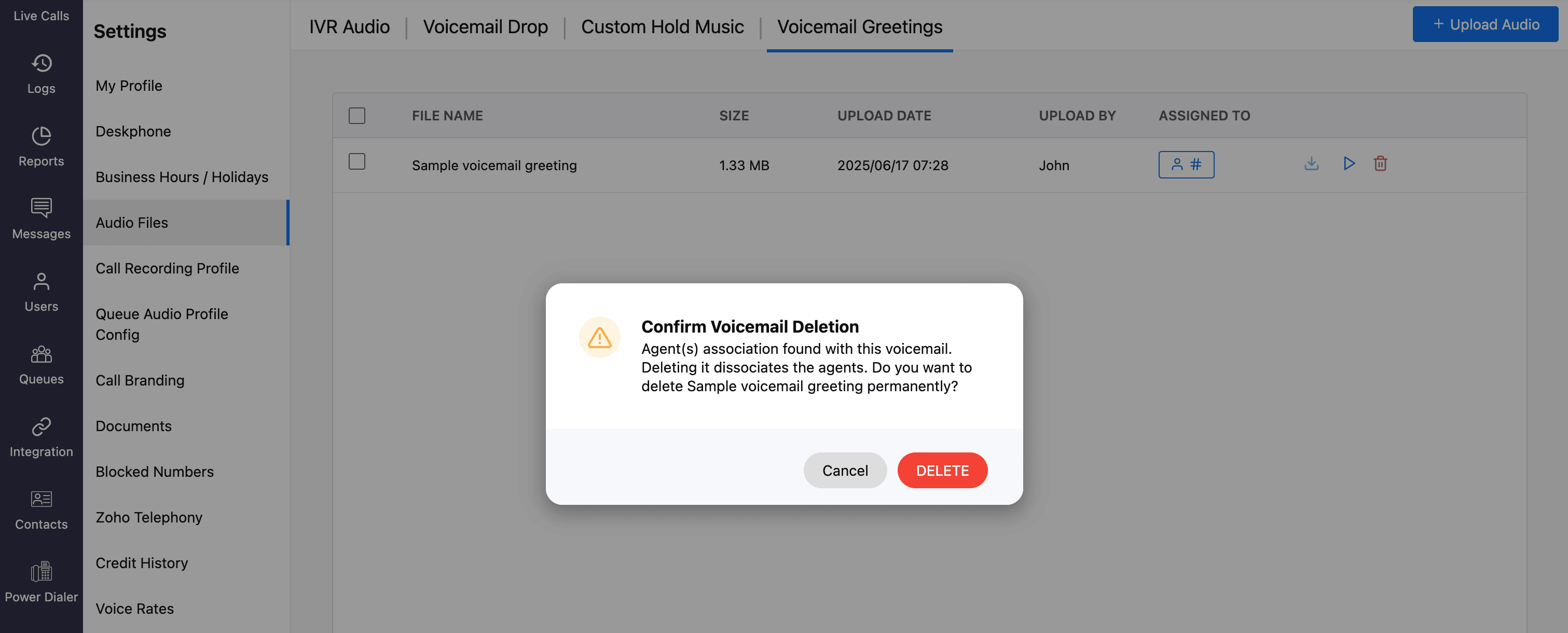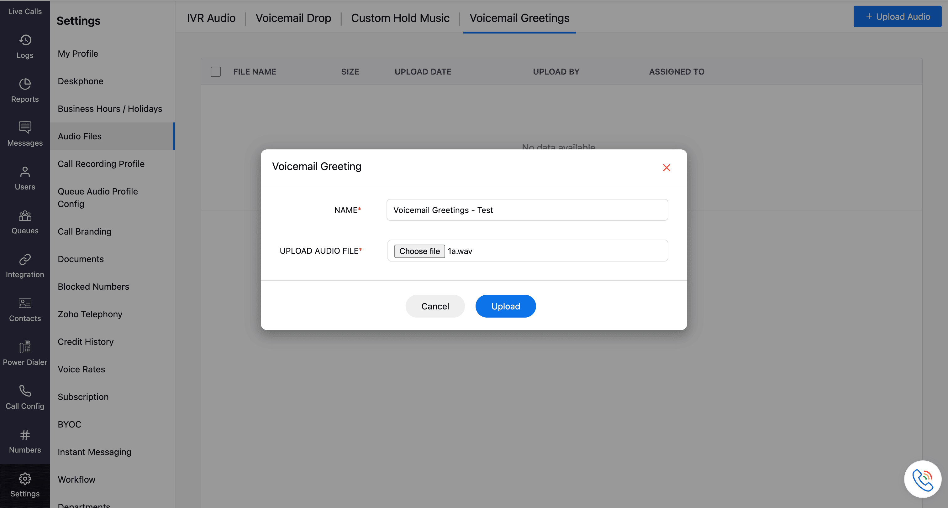 Note: When bulk deleting uploaded custom music files, if the default audio is among the files being deleted, Zoho Voice will automatically revert to the built-in hold music.To upload a voicemail greeting audio file: