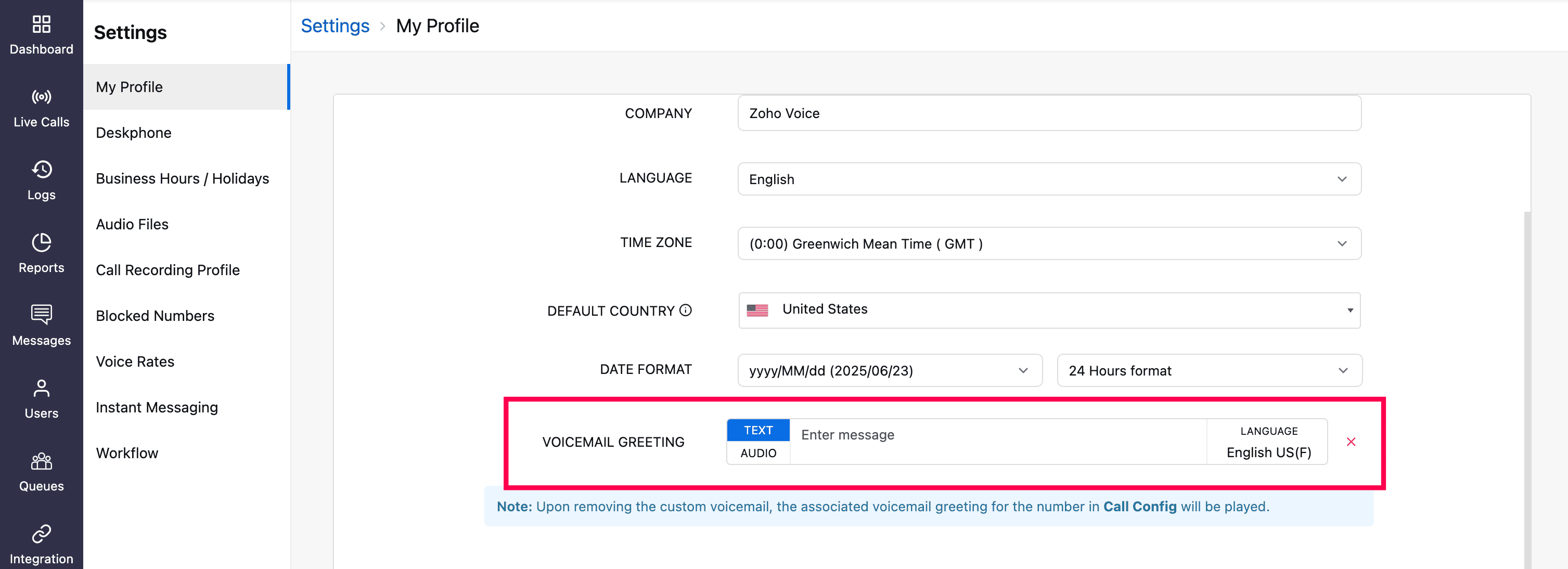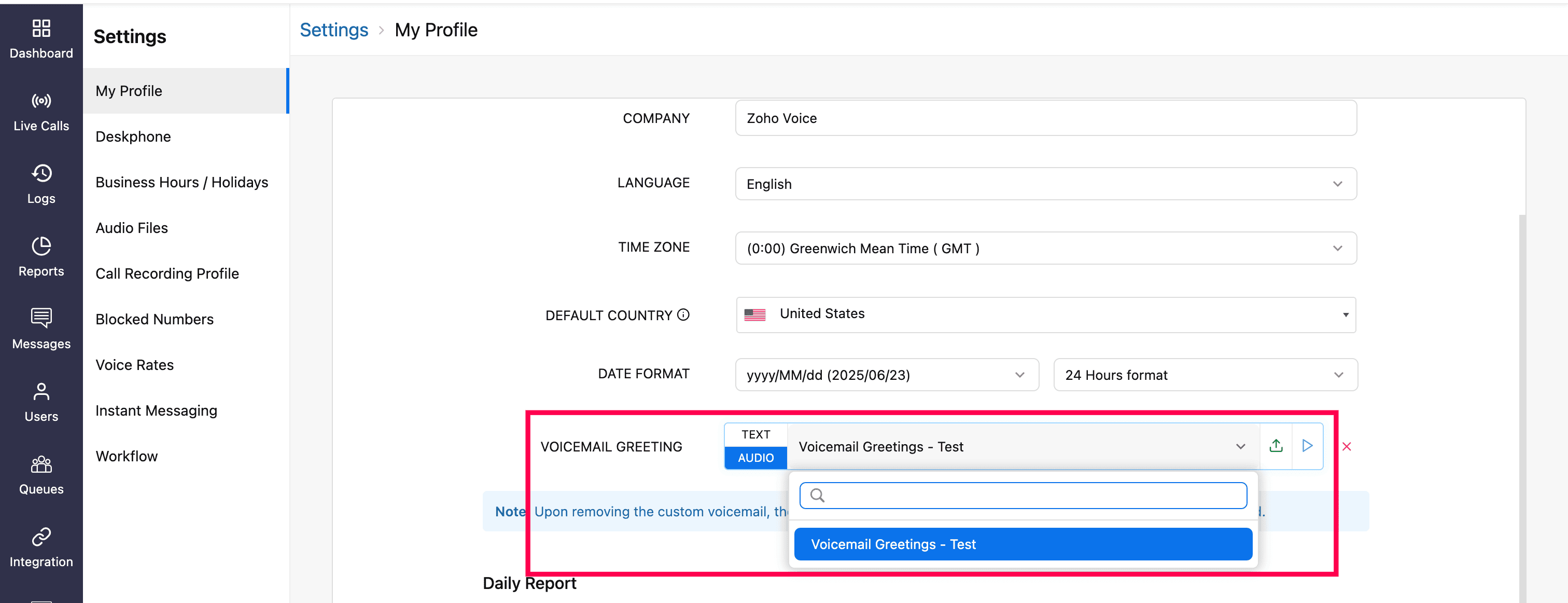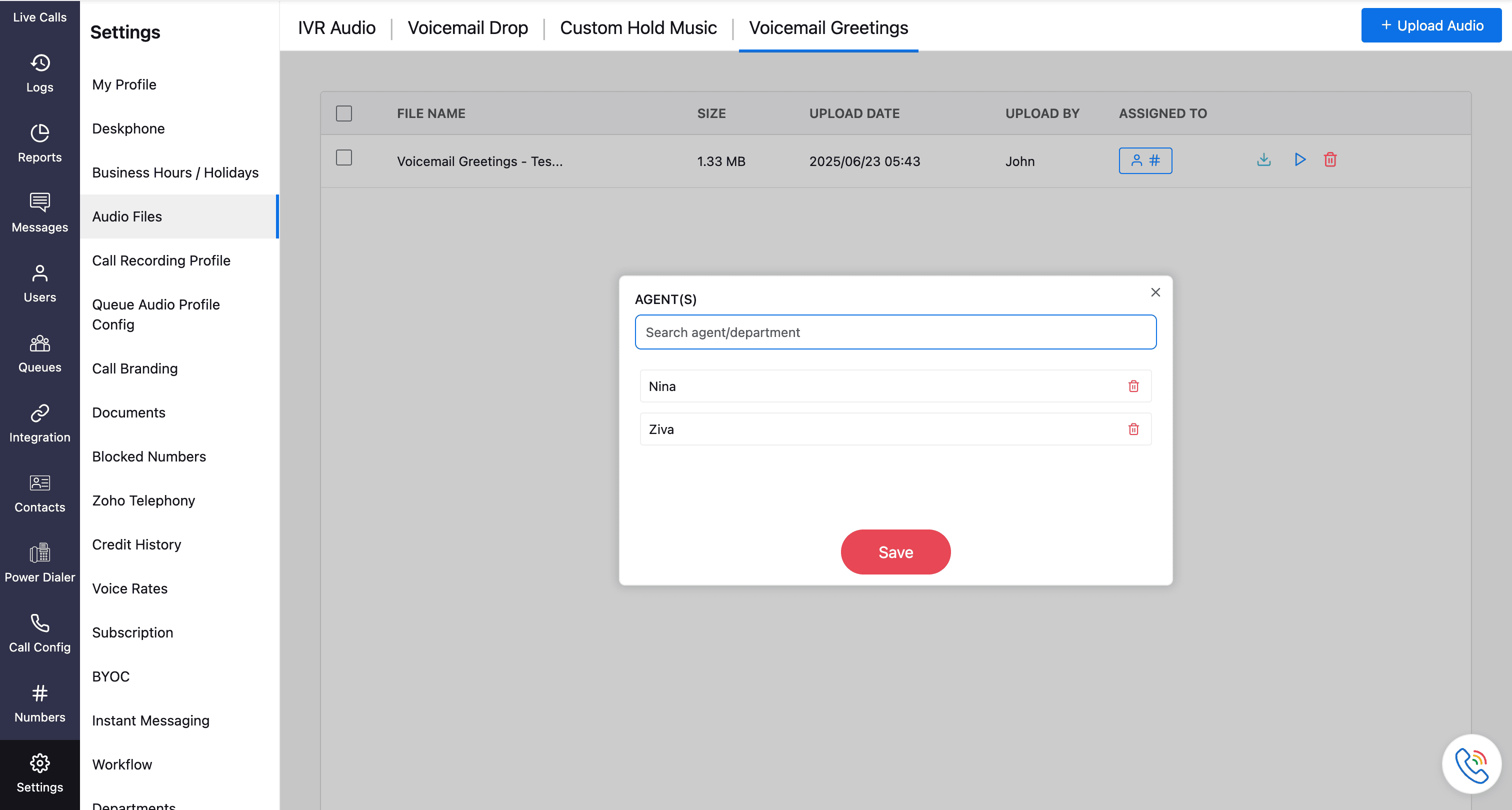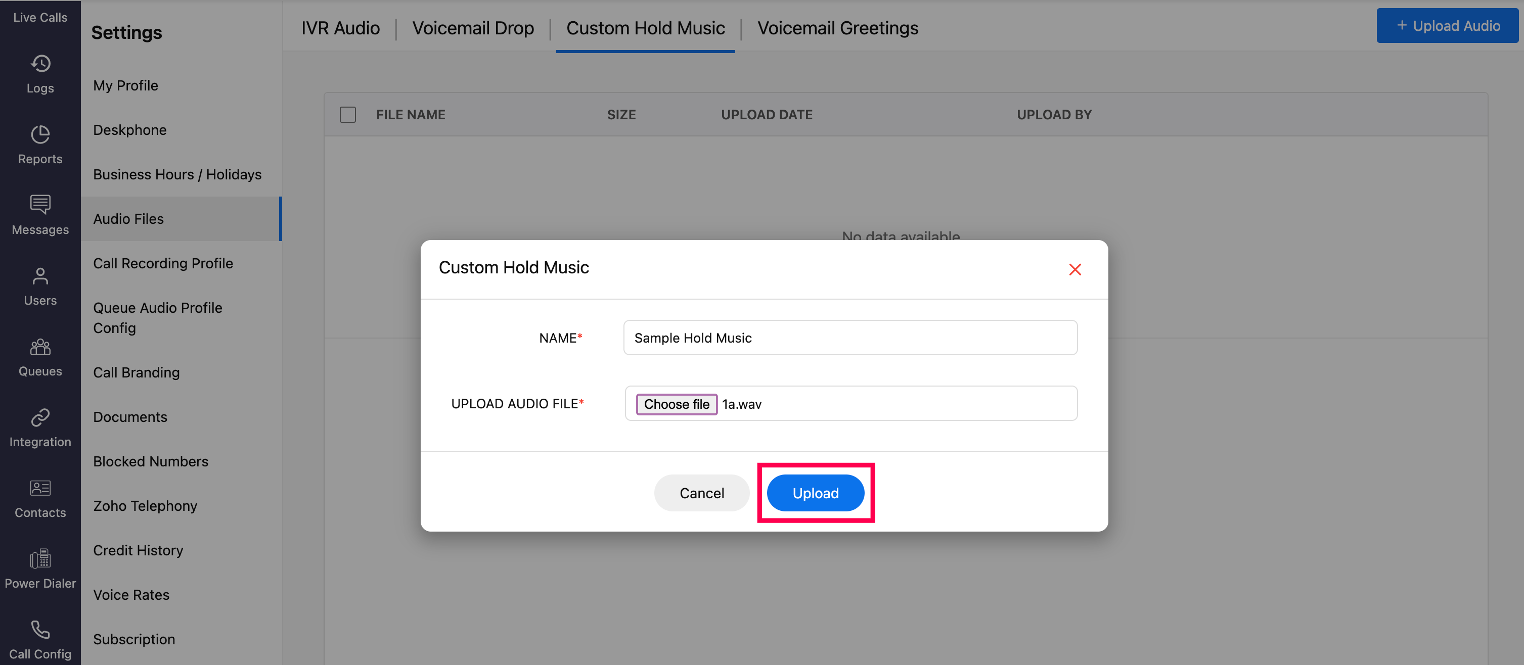 Note: When bulk deleting uploaded custom music files, if the default audio is among the files being deleted, Zoho Voice will automatically revert to the built-in hold music.To upload a voicemail greeting audio file: