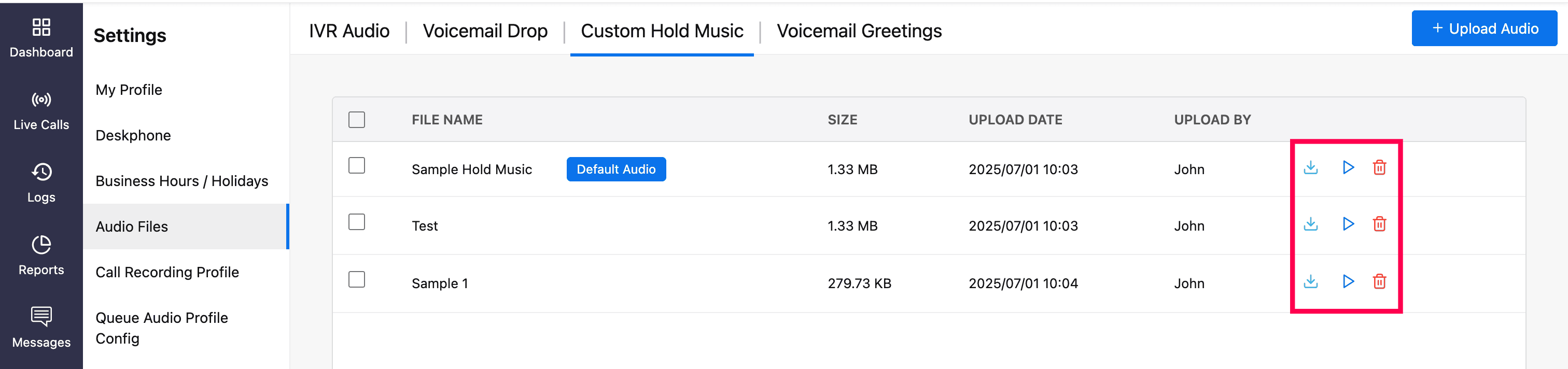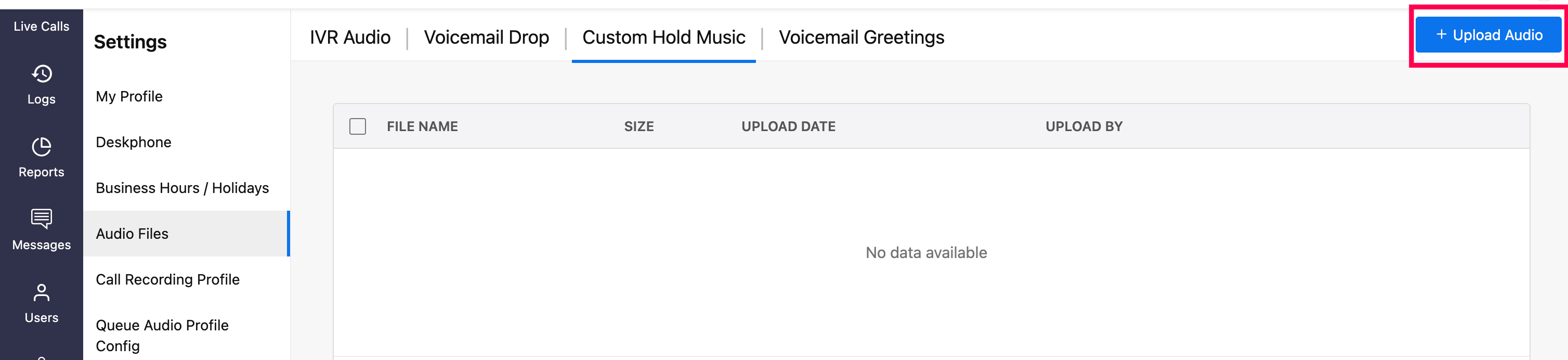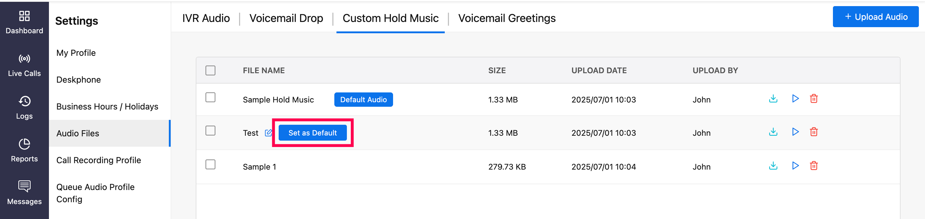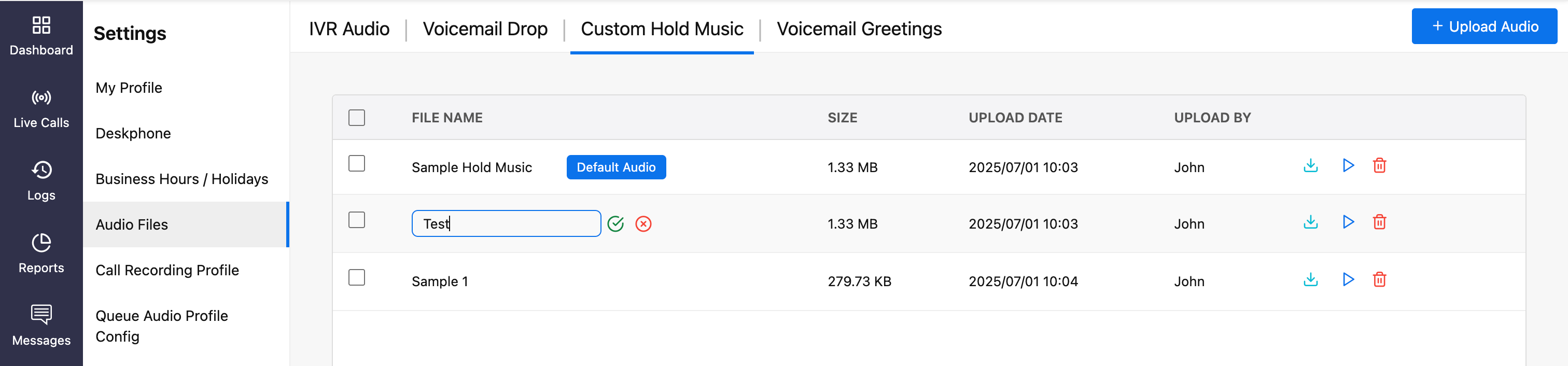 Only super admins and admins have permission to upload and set the custom on-hold music files.