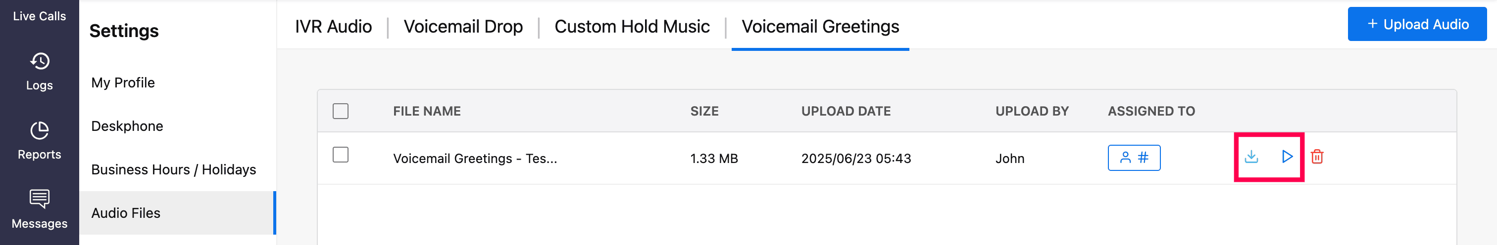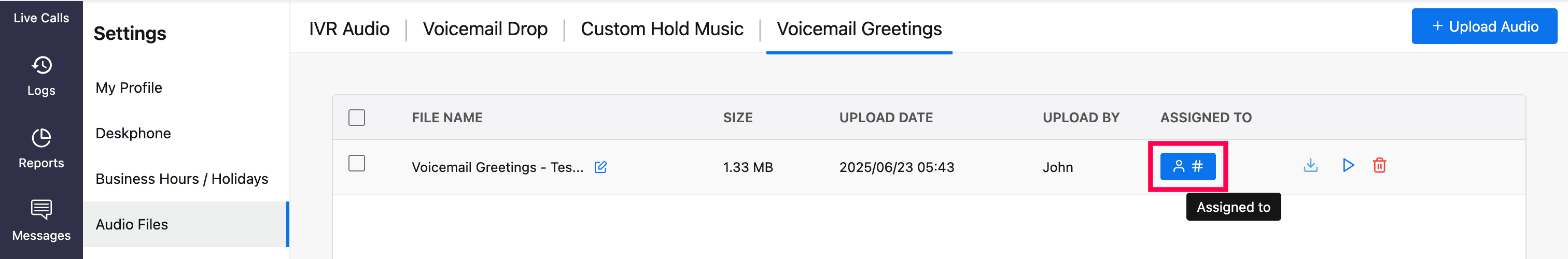 On the Voicemail Greetings homepage, click the Assign to icon of the file.