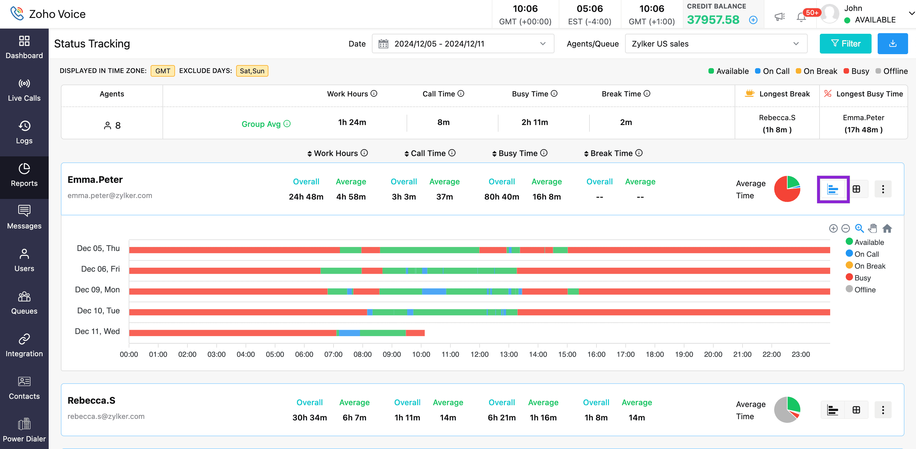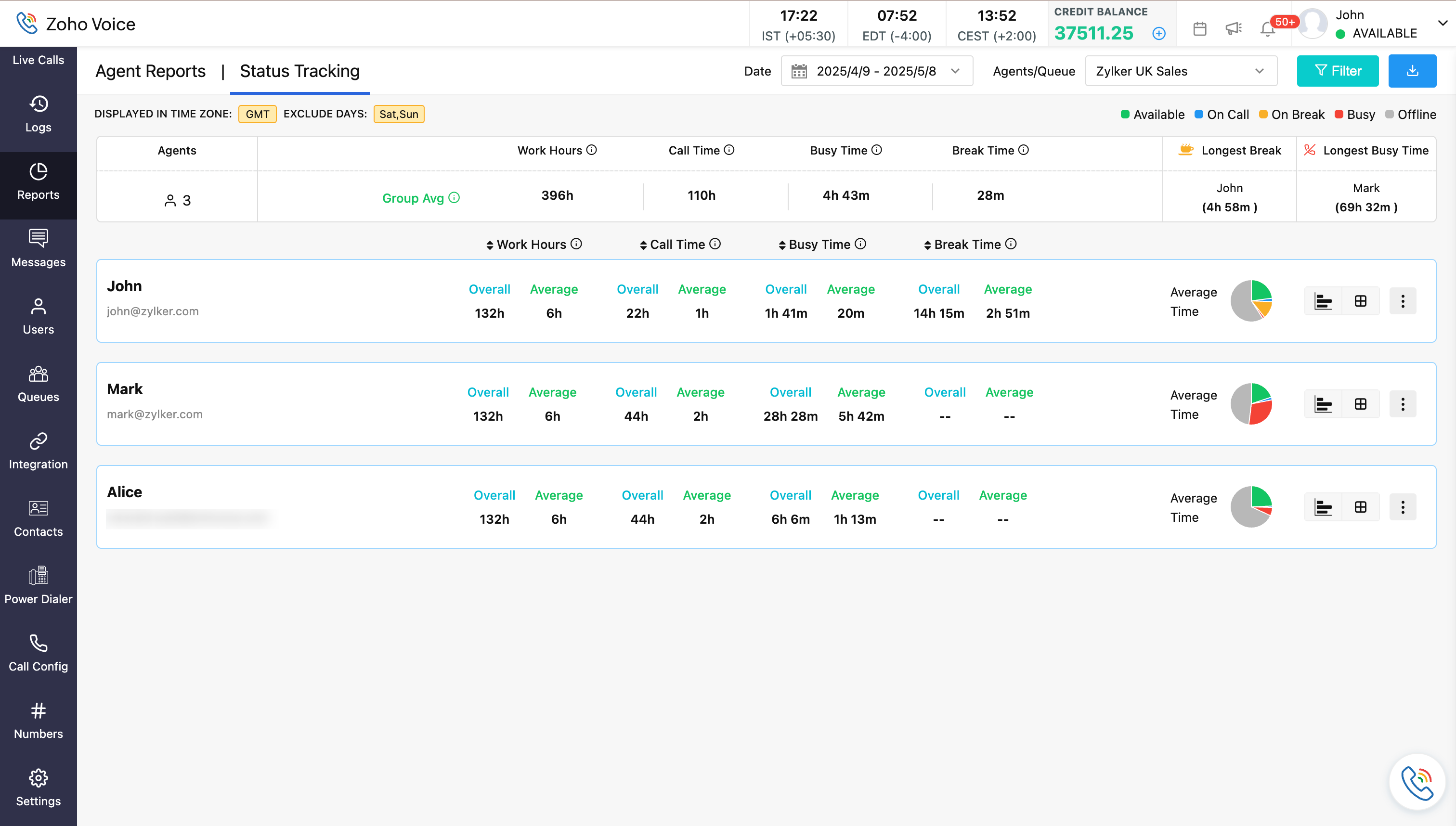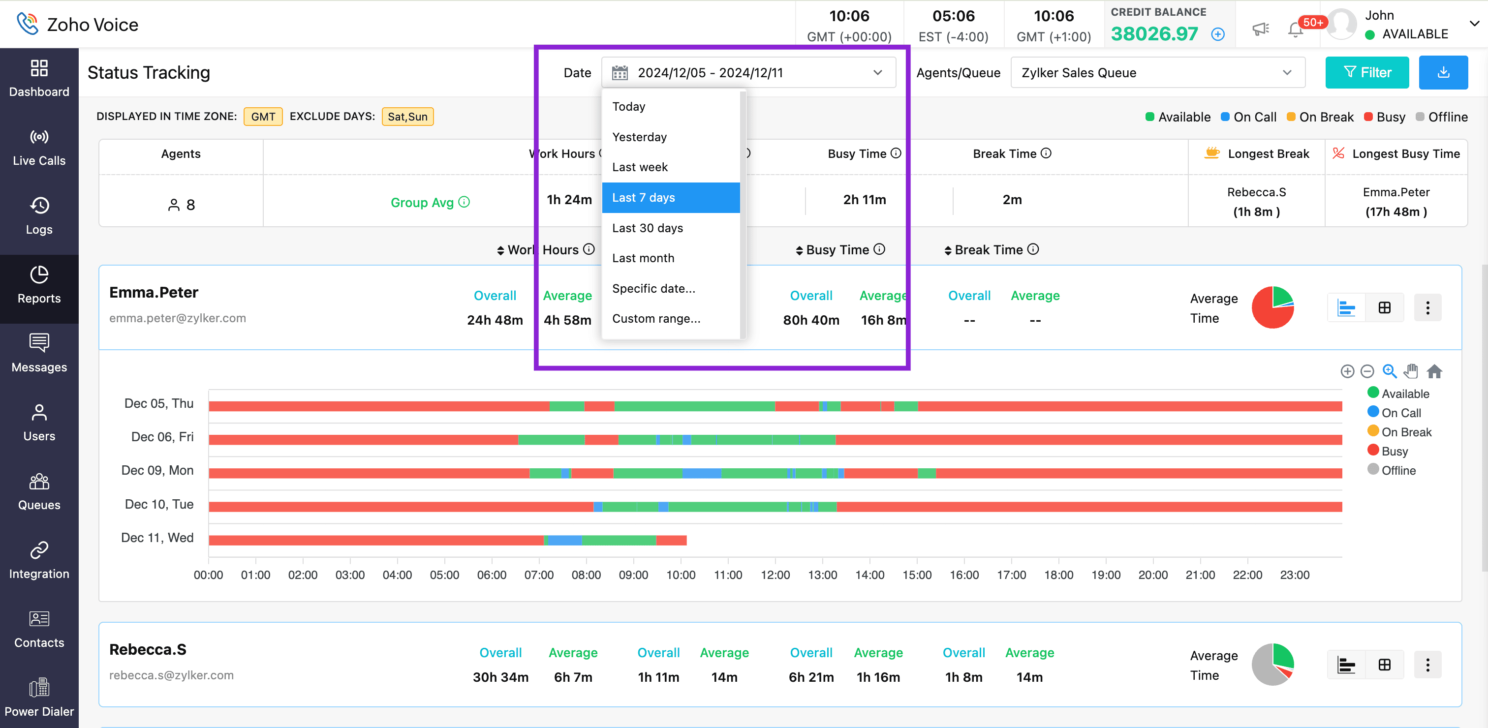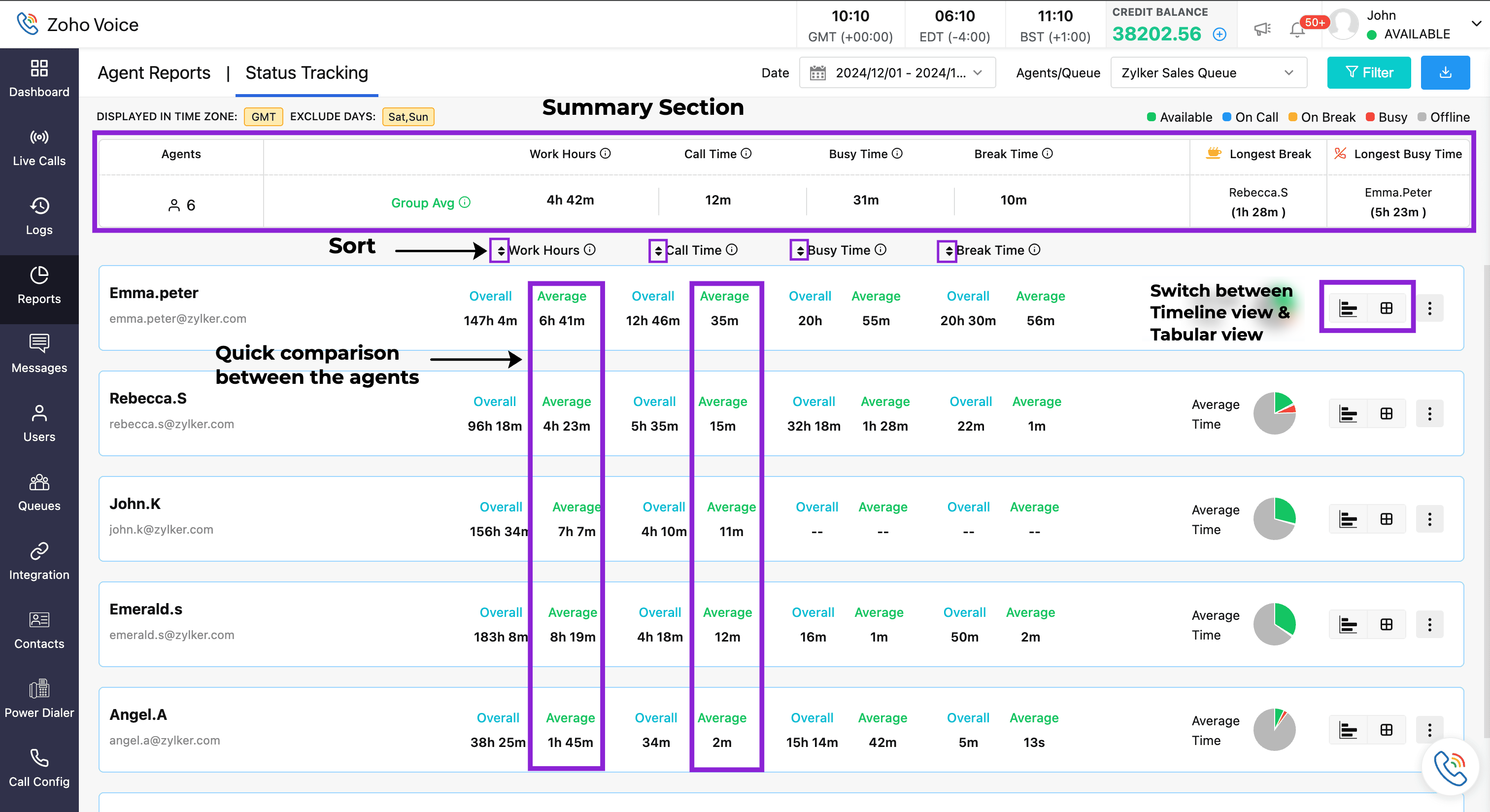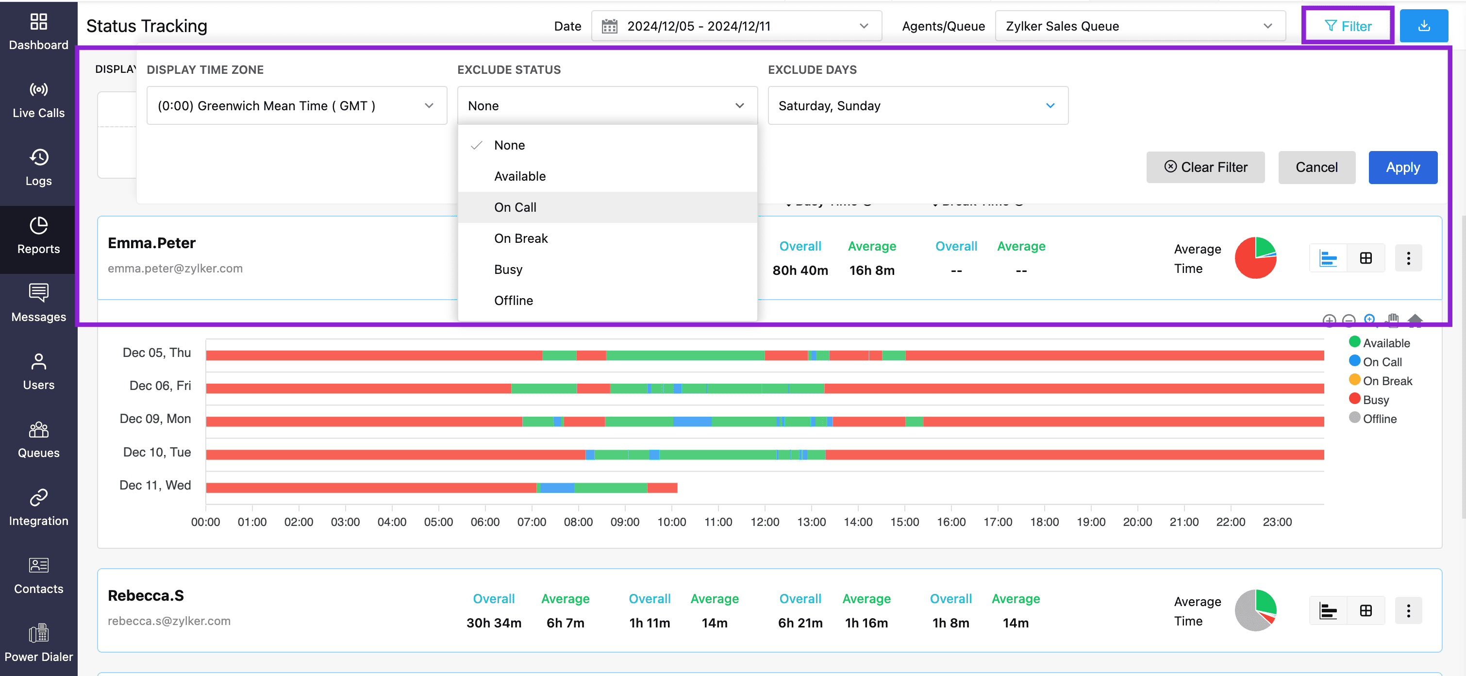 Status: This showcases the agent's status. The status includes On Call, Available, On Break, Busy, Offline.