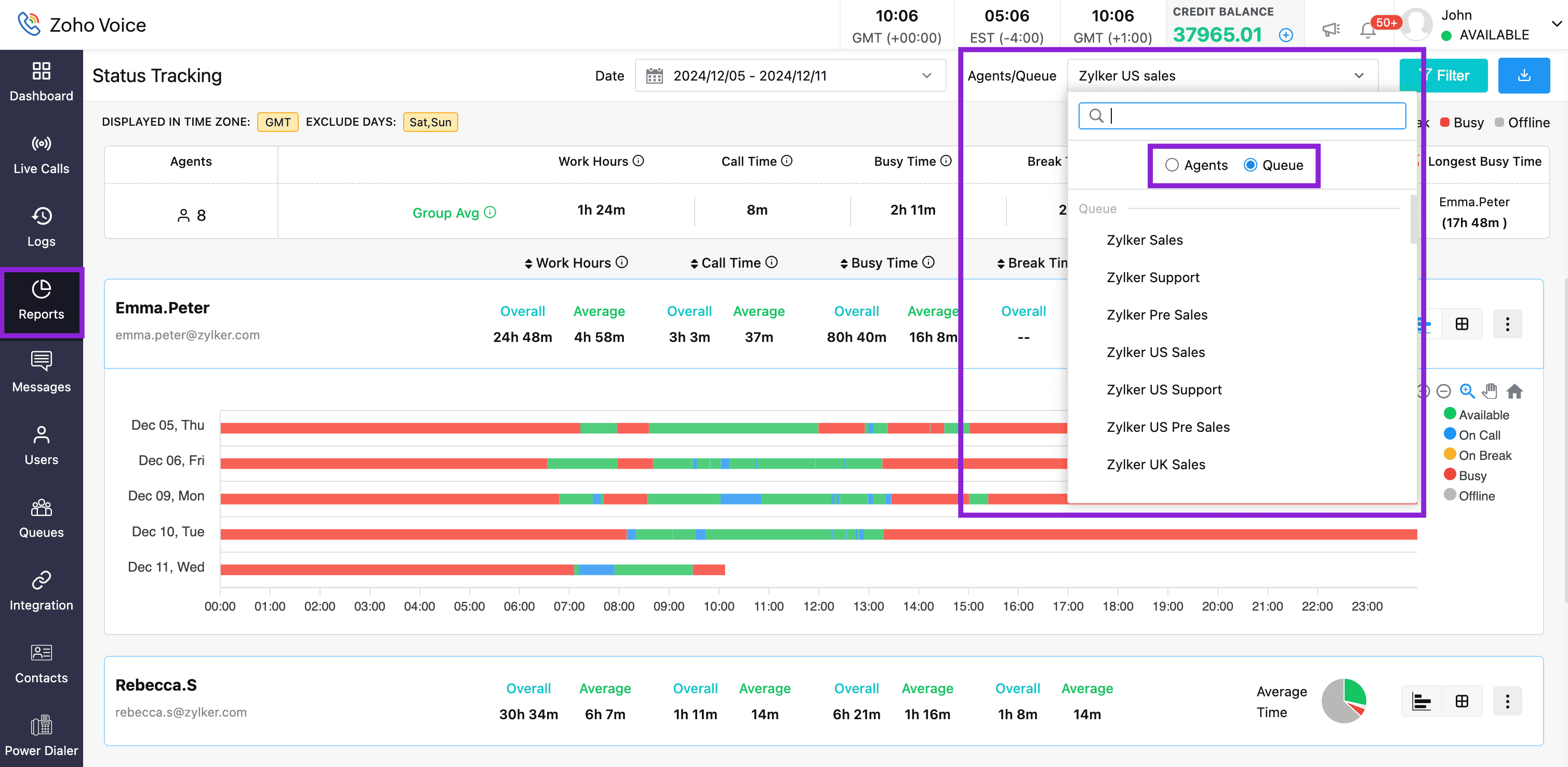 Overview of the agent's activity: The supervisor/admin can view the overall hours breakdown of their agents' activities. They can also view, in correlation with queue calls and their ringing order. By comparing the log data with ringing orders and agent activity, supervisor/admin can get a clearer picture of the agent who was offered a call and why other agents did/did not respond.