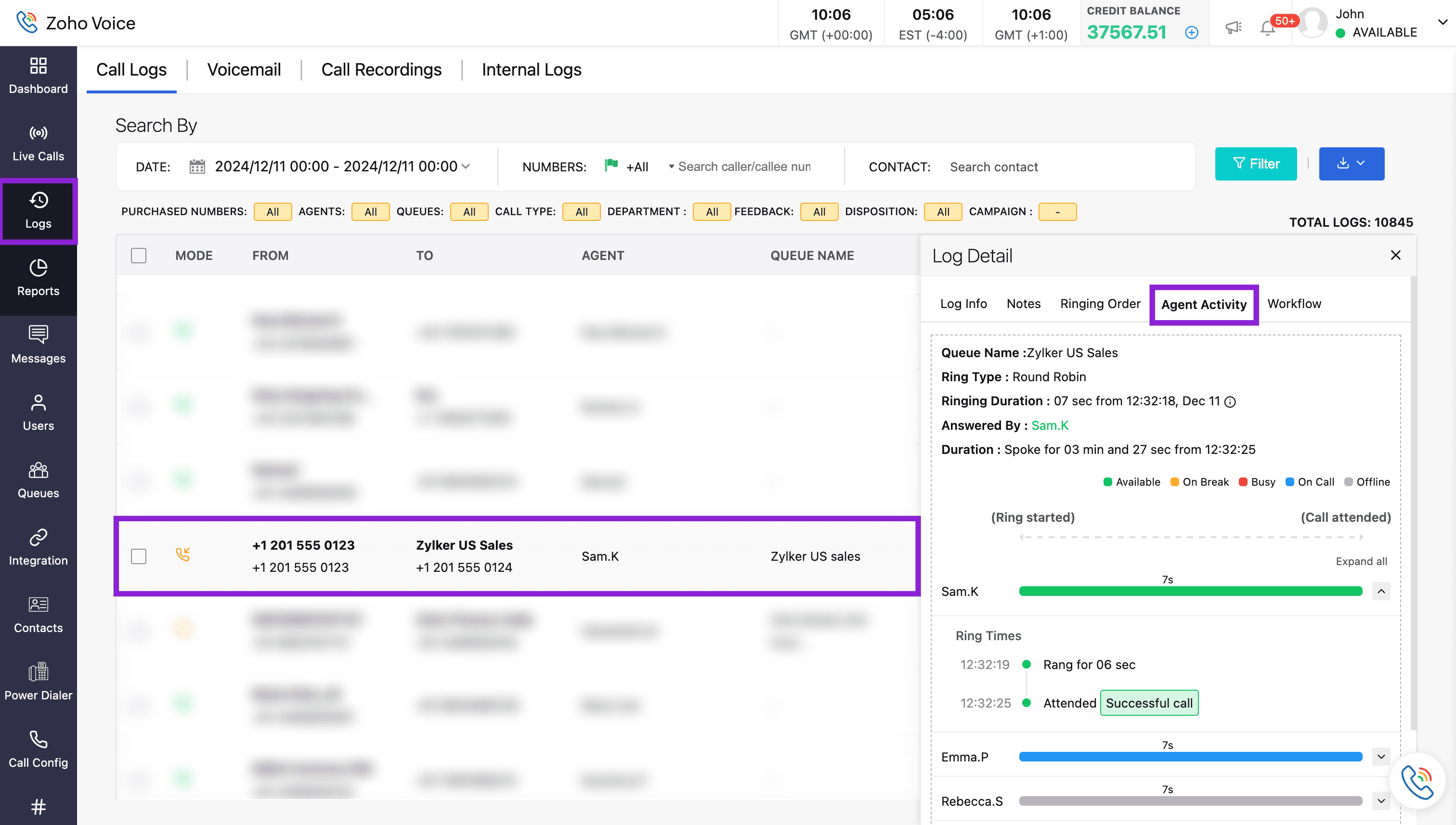 Navigate to Logs, select the required incoming or missed call log for which a queue is assigned, then click the Agent Activity tab. You can view the Ringing Duration, who answered the call, Spoke Duration, and other activity of the call.