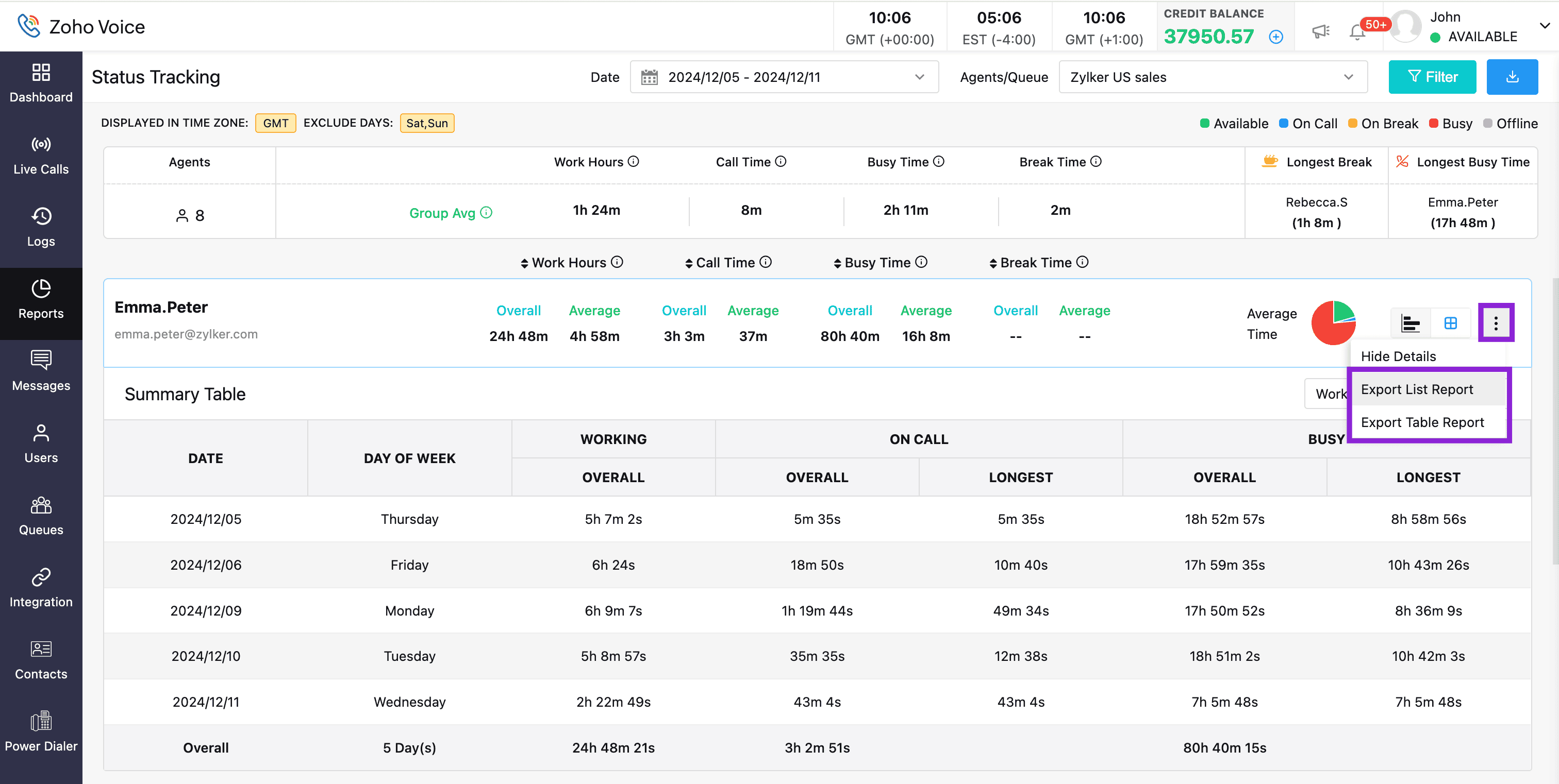 To download an individual agent's report, go to Reports, then select the required Date range and Agents/Queue. Select the agent and click the ellipsis (three dots), then click Export List Report or Export Table Report.
