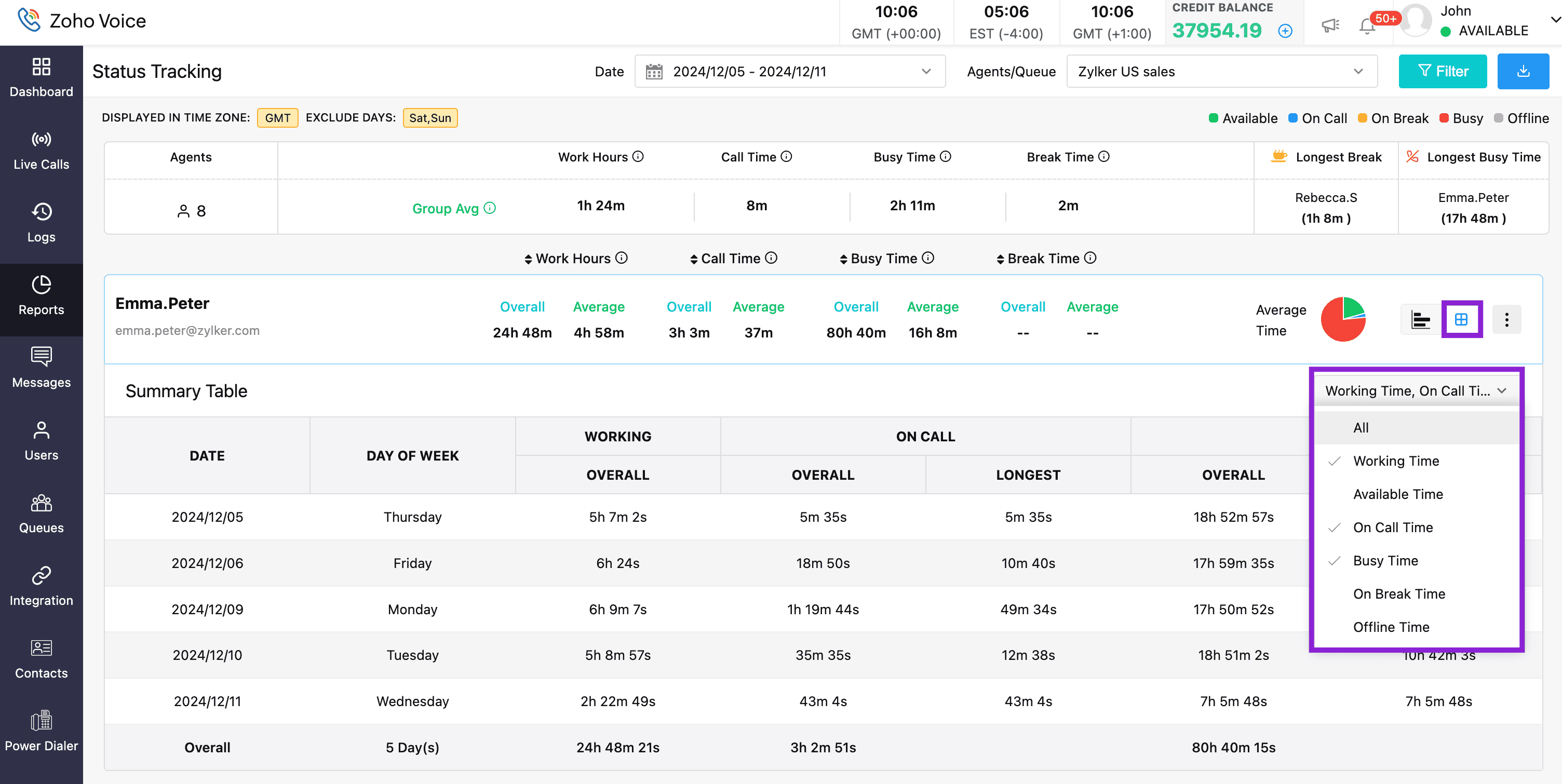 Overall Work Hours = (Total time spent in Available status + Total time spent On Call) during the selected period