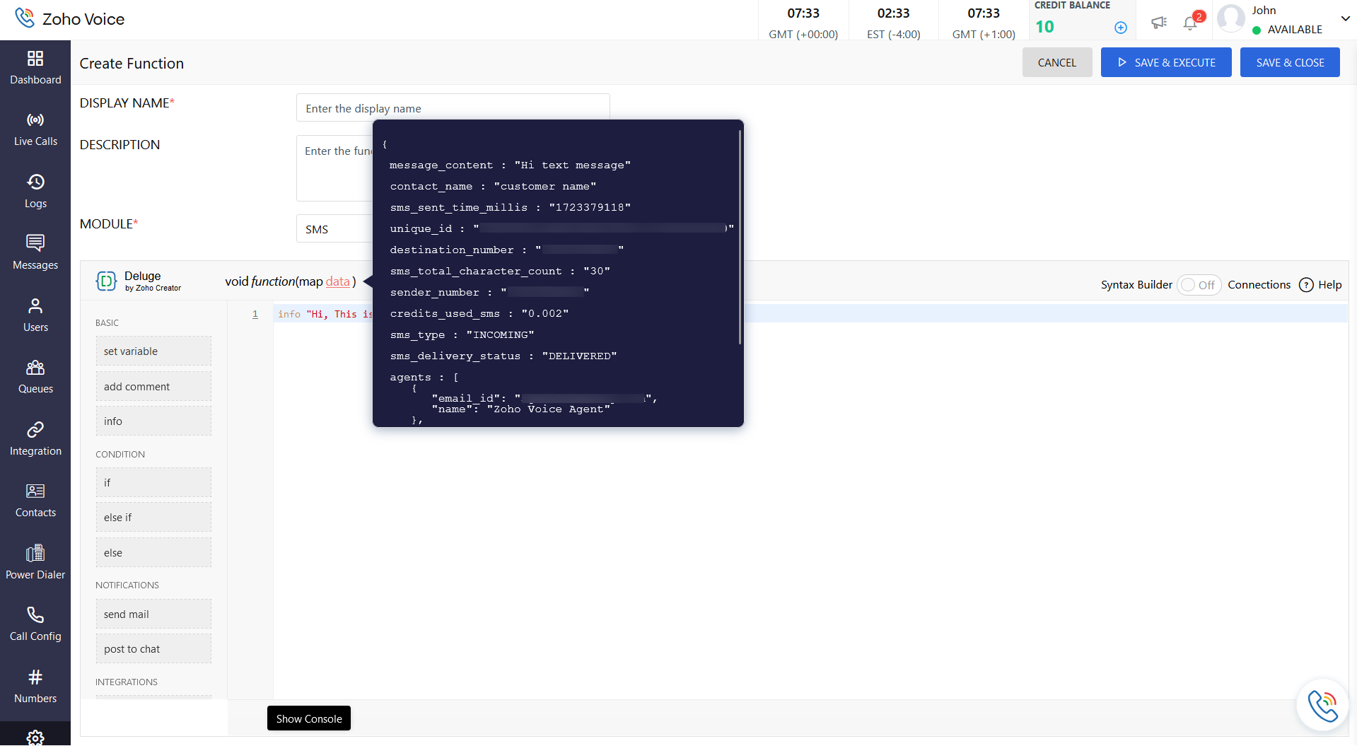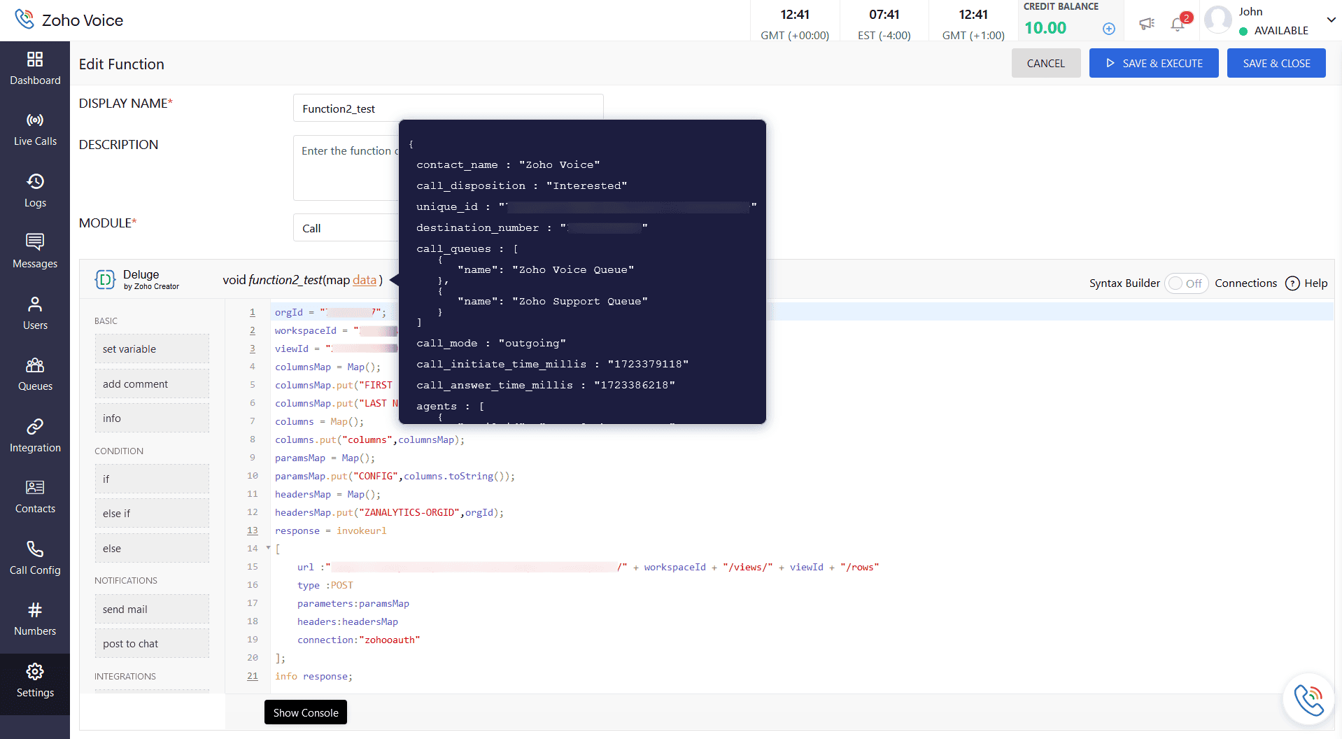 Functions are the building blocks of Deluge scripts that define the specific actions and behaviors of your Zoho Voice connections. They allow you to customize how your connected services interact with Zoho Voice. You can create your own functions or use pre-defined gallery functions designed to post the event logs to the connected services.