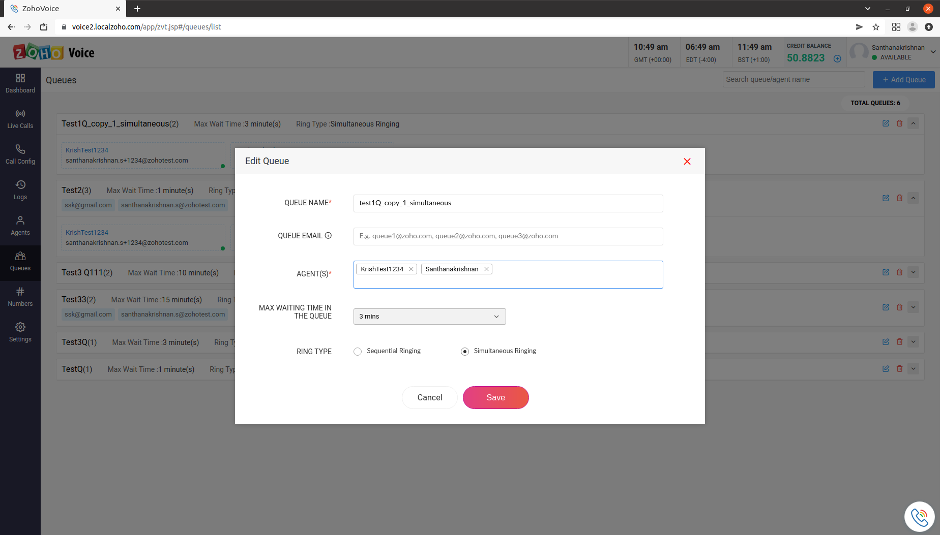 If you have configured a queue for two or more phone numbers with different 'max time in queue' and 'ring-type', then you will find as many queues - with same agents but with a different max time and ring-type. For existing phone numbers, we have assigned different names for these queues and associated them according to your previous configurations. You can edit the name and save.