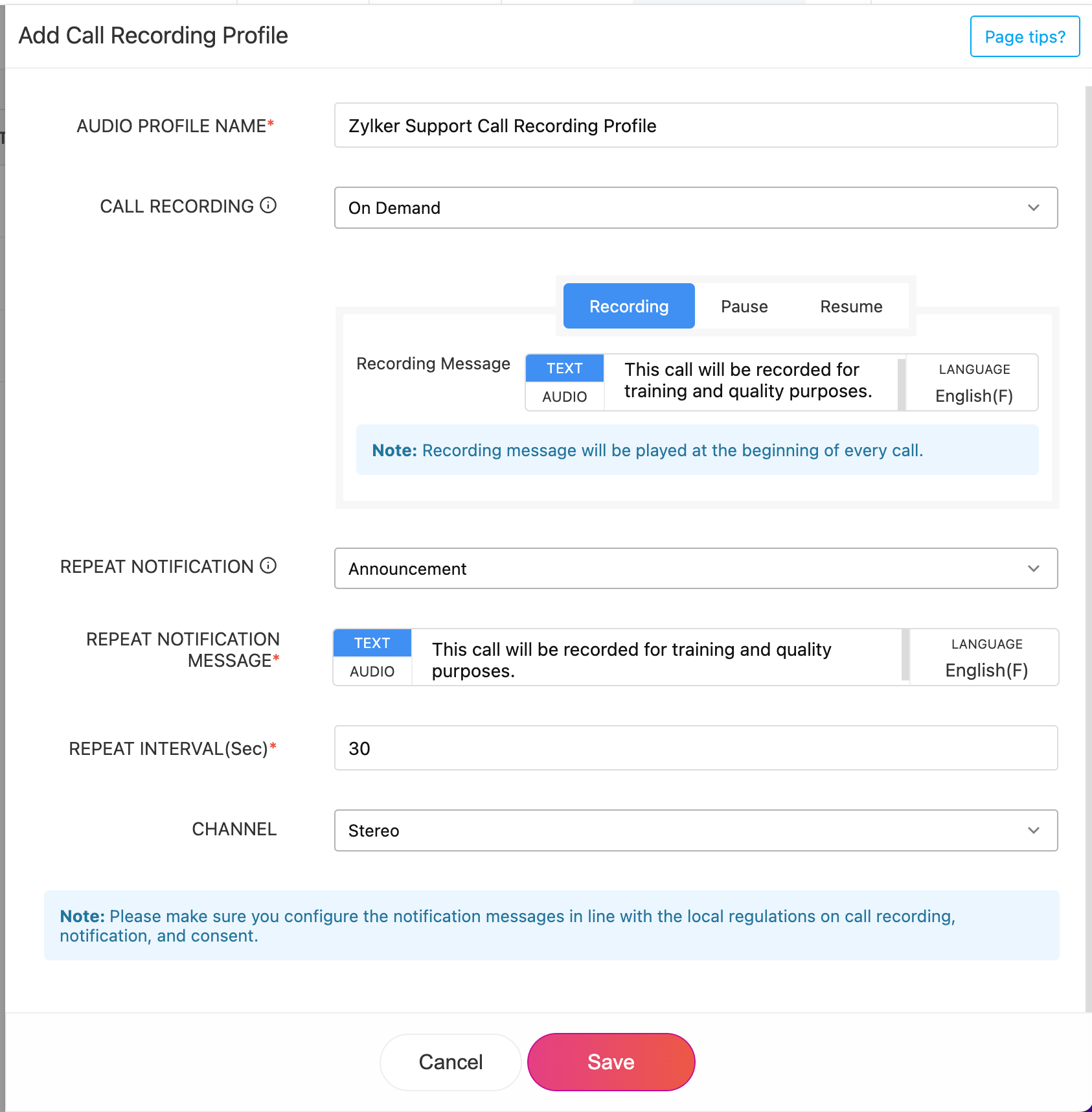 Along with the “Recording” message that announces to the call participants that the ongoing call is being recorded, Zoho Voice also lets you notify participants with customized “Pause” and “Resume” messages whenever a call recording is paused and resumed, respectively.