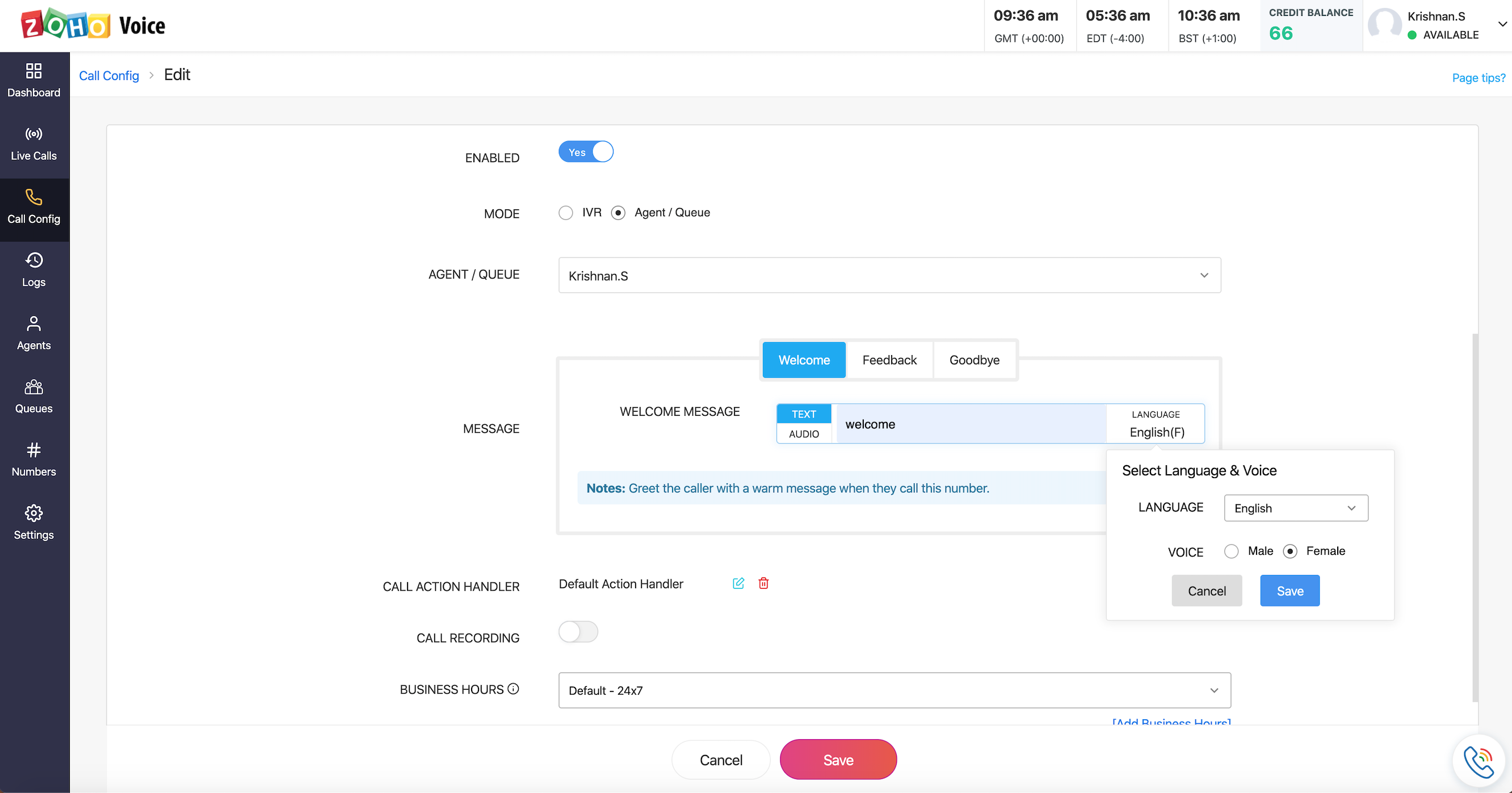 Zoho Voice now provides an option to choose between a male voice and a female voice. You can select it in the Language and Voice selection box itself.