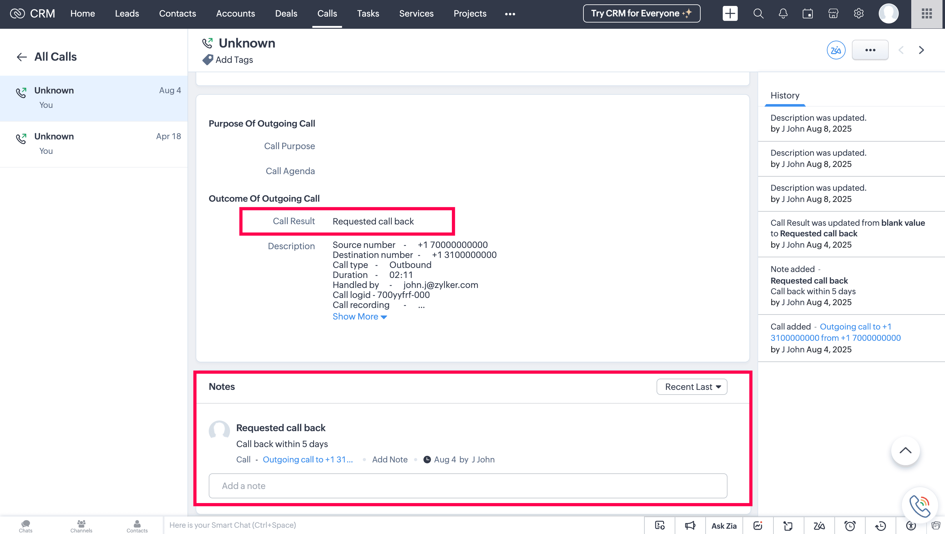 The notes and disposition added for a call will appear in the respective call log within the Calls module in your Zoho CRM account.