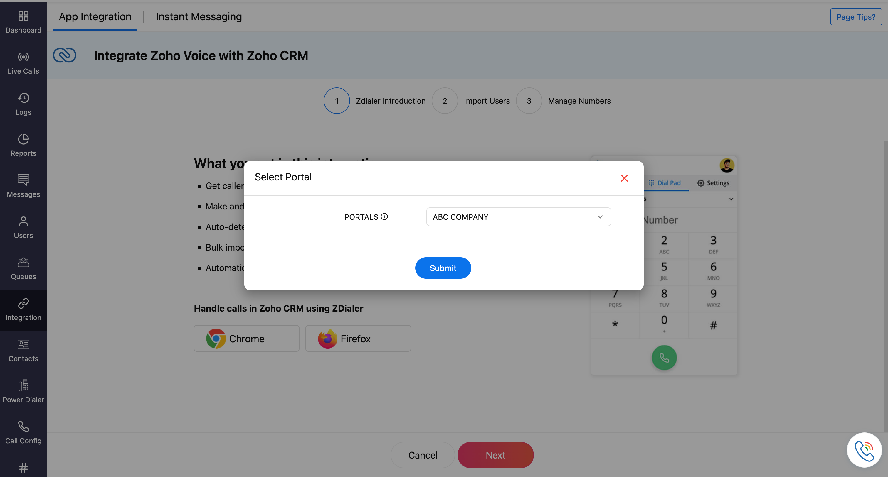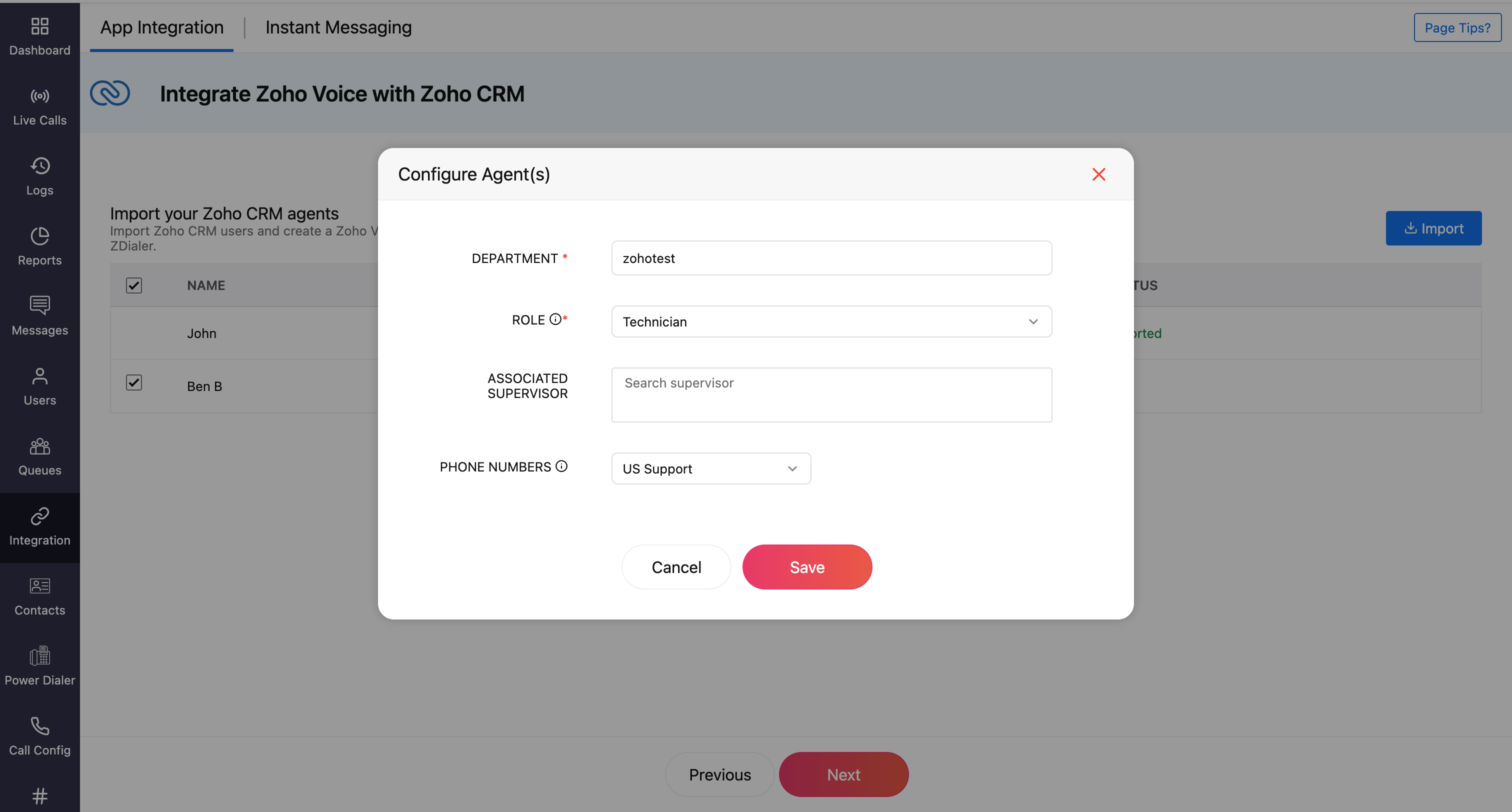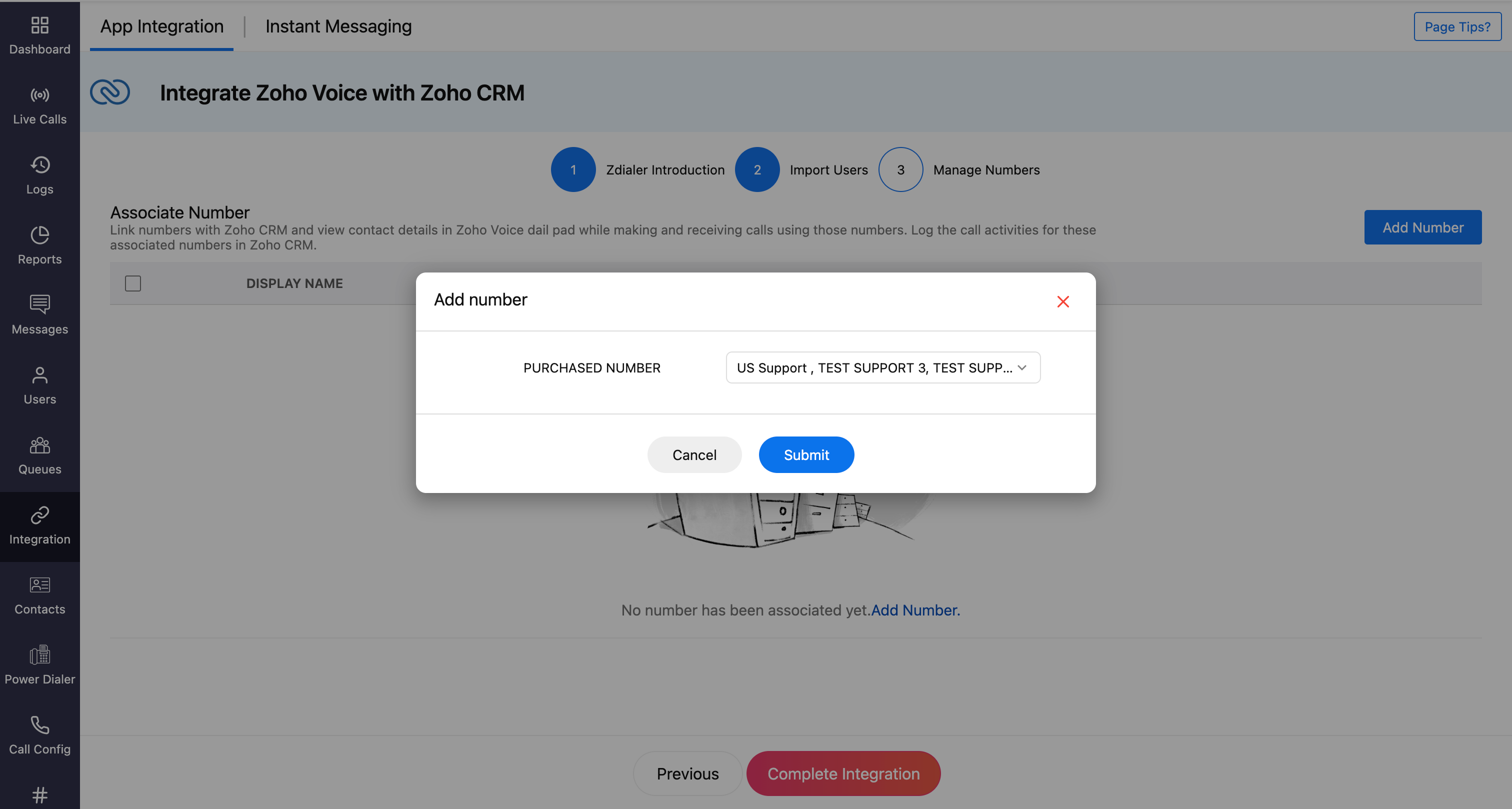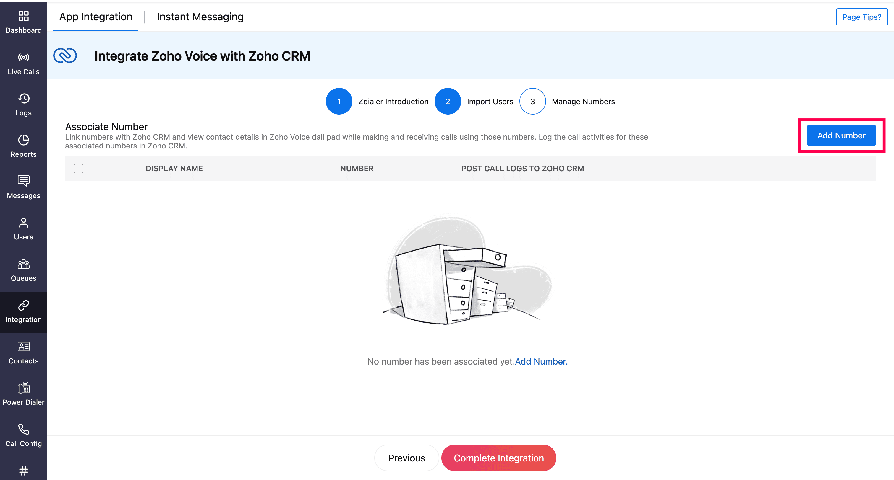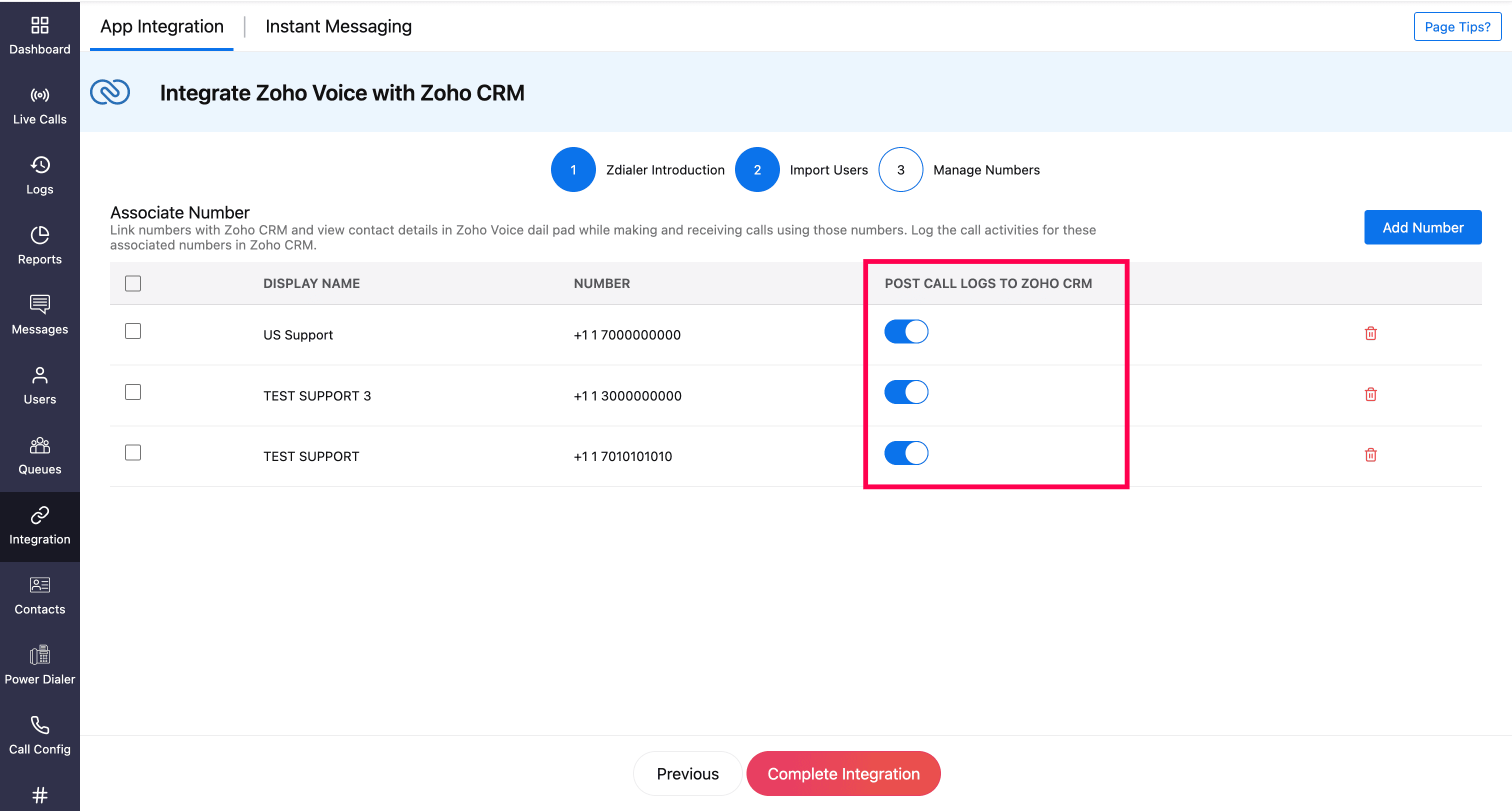 Note: Make sure that the Post Call Logs to Zoho CRM is enabled. This ensures that the call logs are automatically logged in your Zoho CRM account.Click Complete Integration.