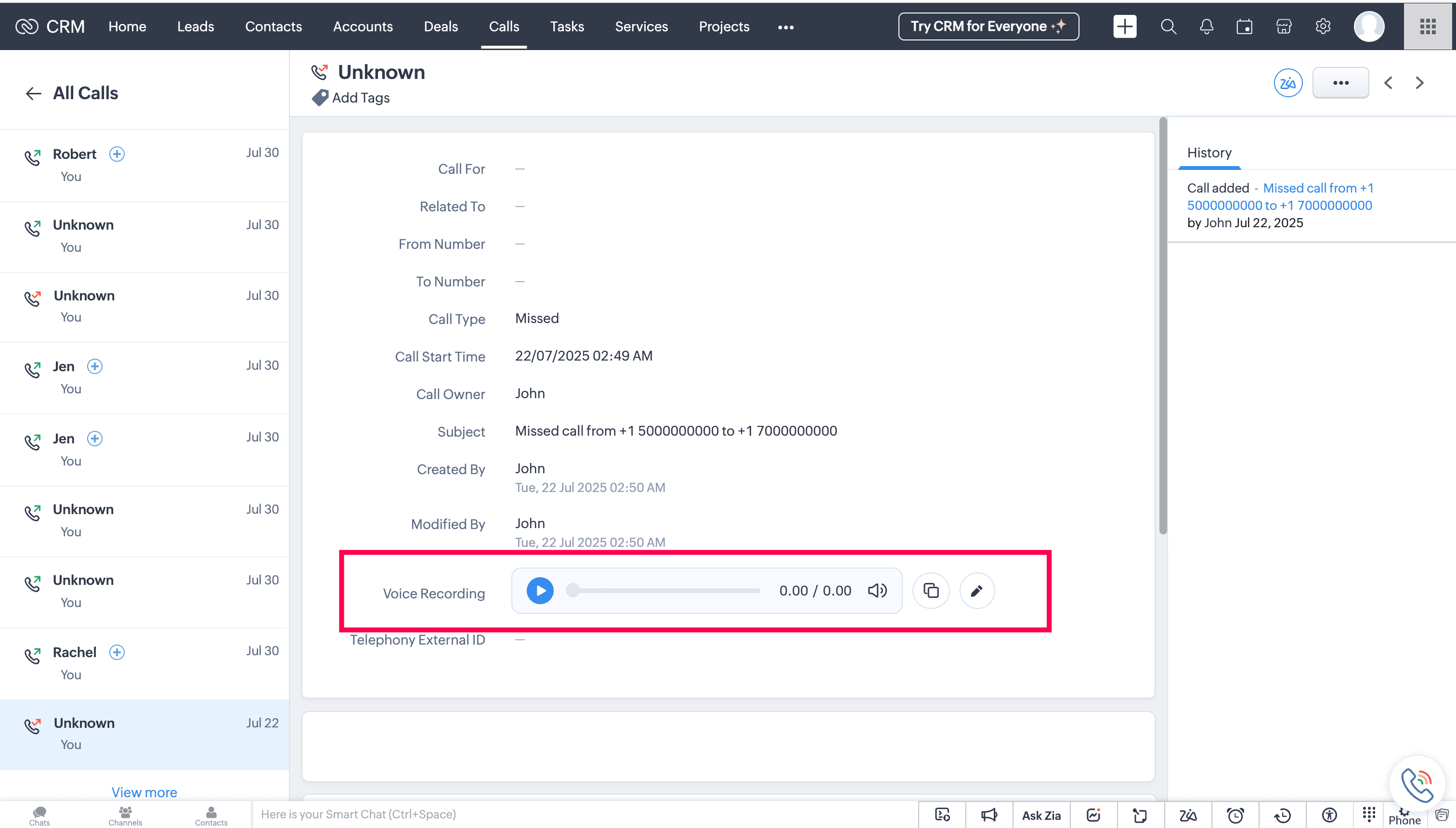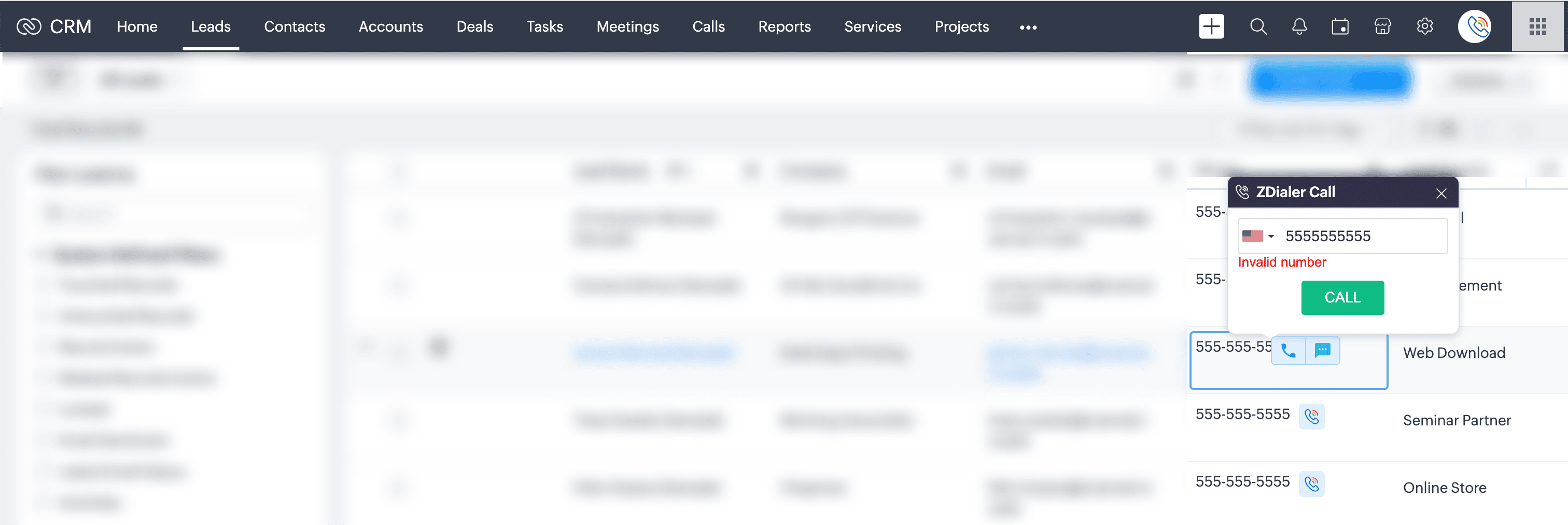 After a call is made or received through ZDialer, the call logs will be automatically recorded and available in the Calls module of your Zoho CRM account.