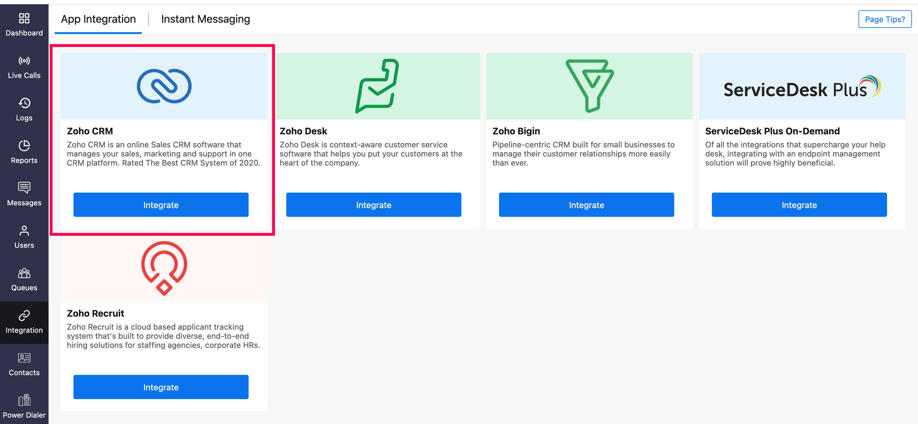 Go to the Integration module, then click Integrate of Zoho CRM.