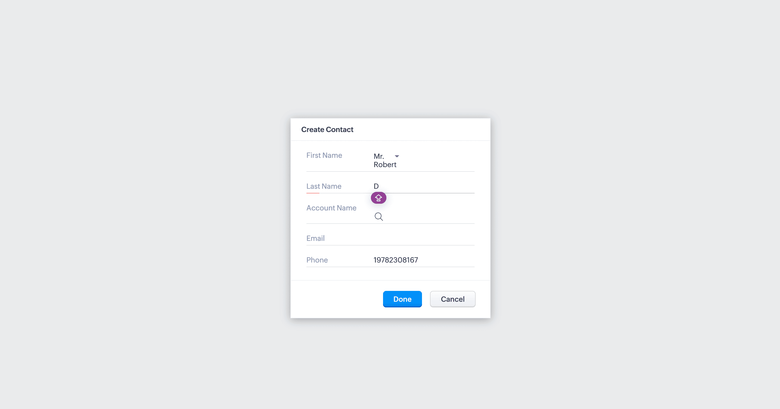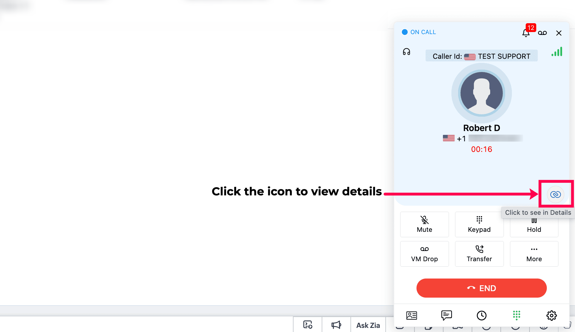 Note: When making or receiving a call using the ZDialer widget in Zoho CRM, the caller details will be automatically fetched from the respective contacts (if available). In ZDialer, if the contact or lead exists in CRM, you can click the CRM icon to navigate directly to the corresponding record’s details.While on a call, if a caller’s number isn’t linked to an existing CRM contact: