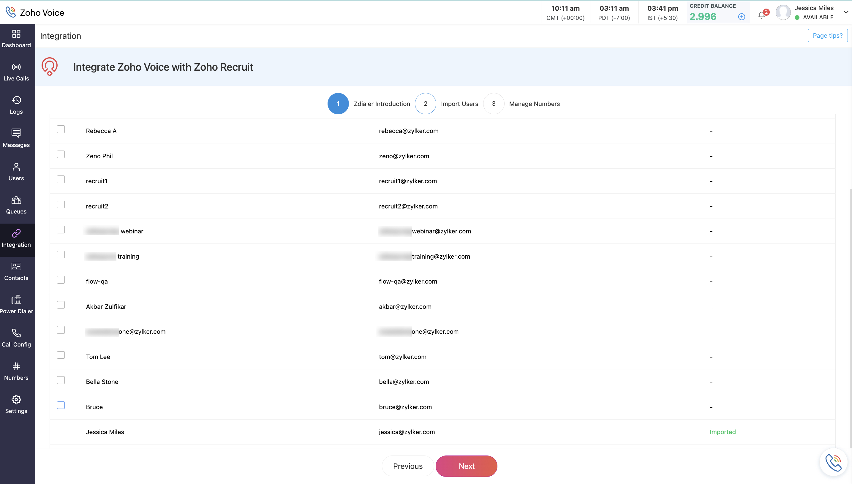 2. Choose the users you want to import into Zoho Voice and click the Import button.