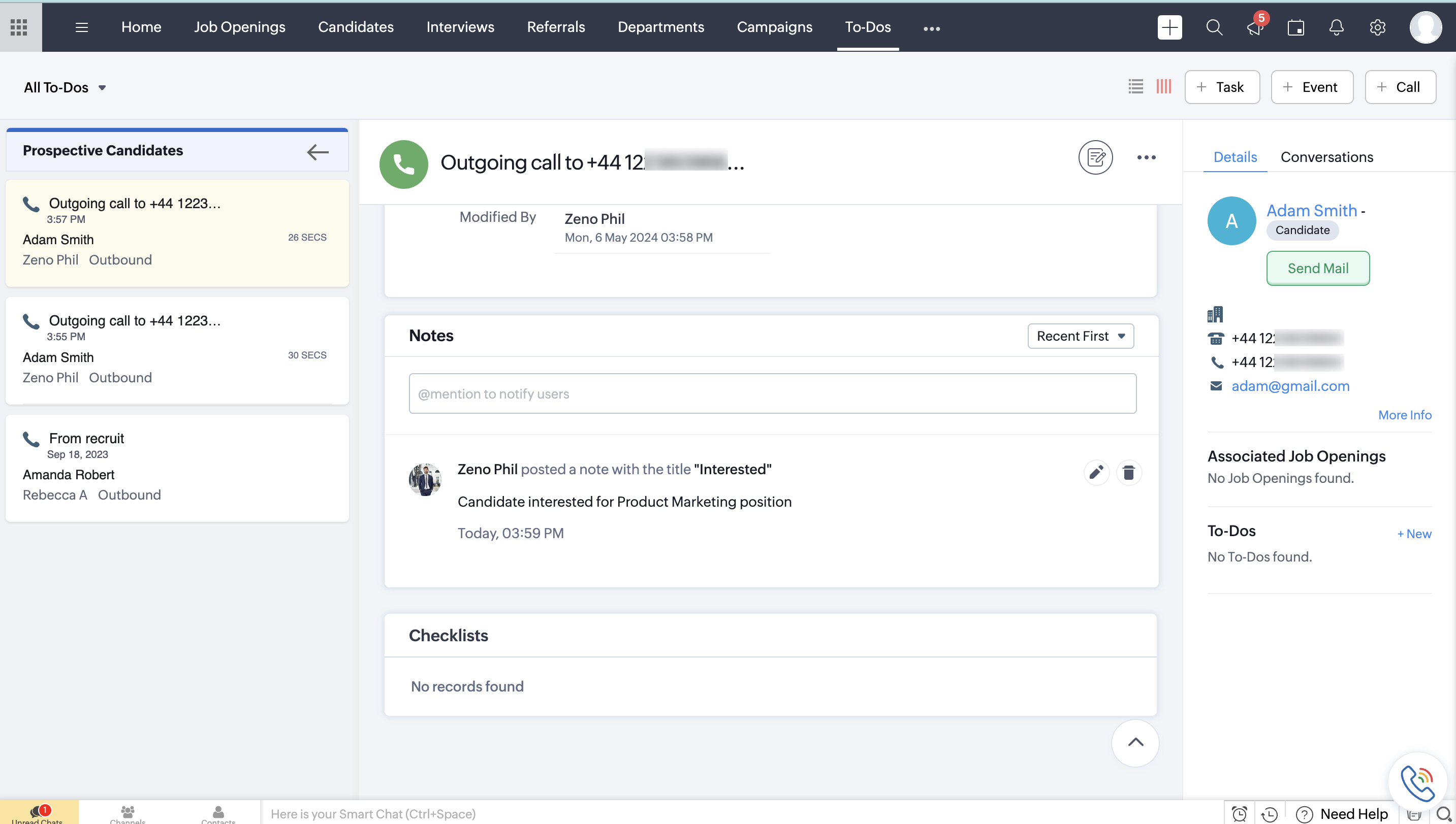 3. Call the candidate directly from Recruit interface via Click-to-Call option and ZDialer brower extension.