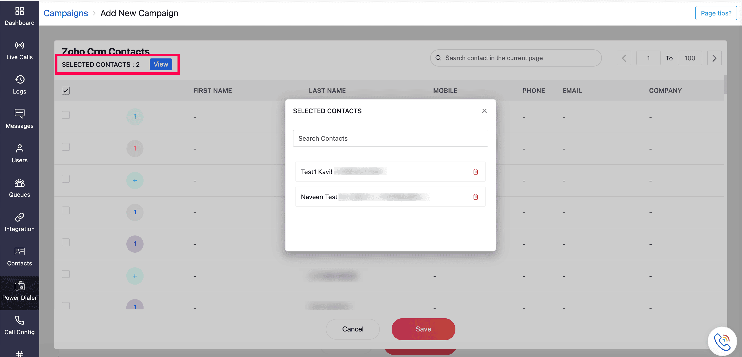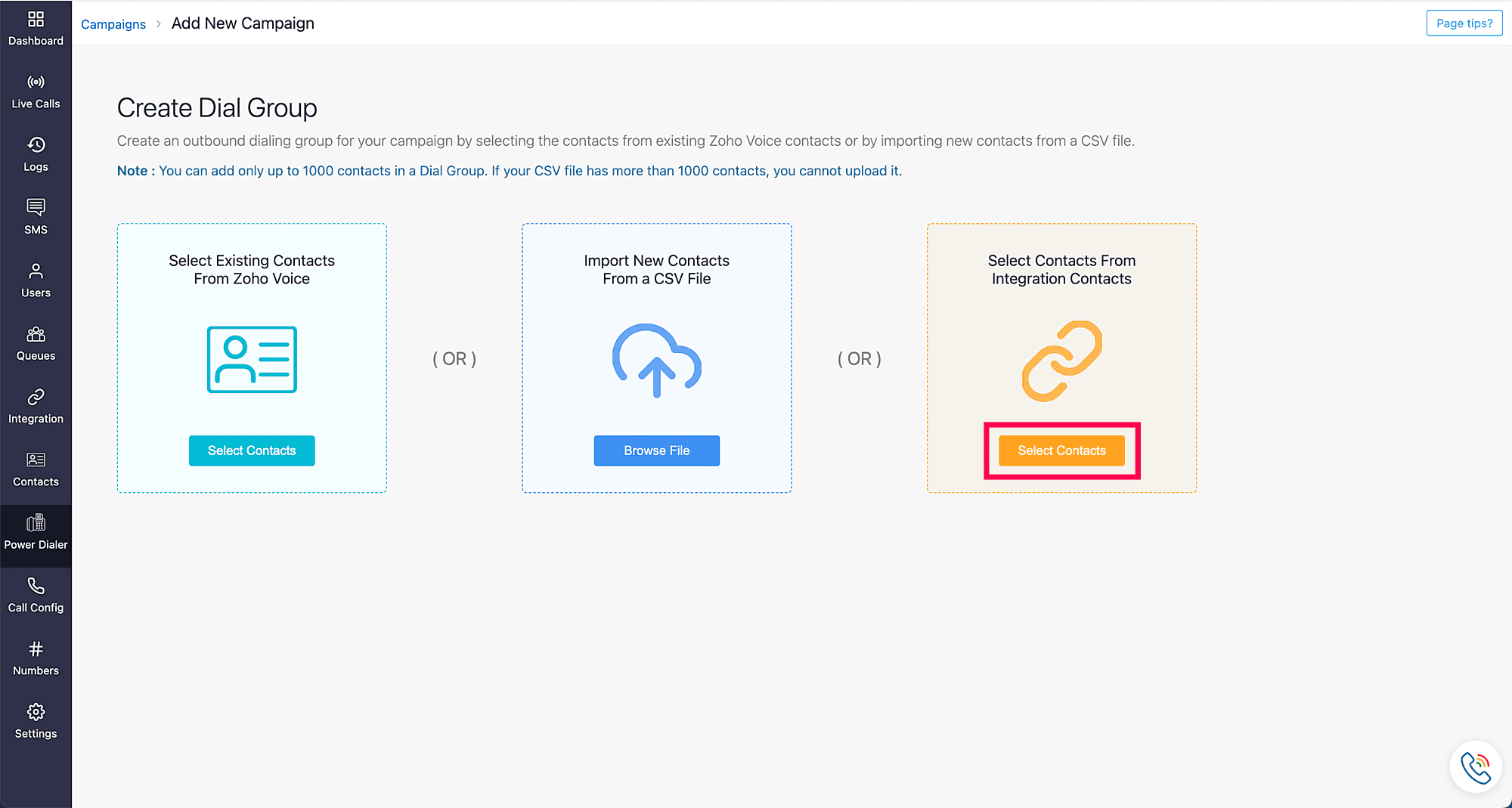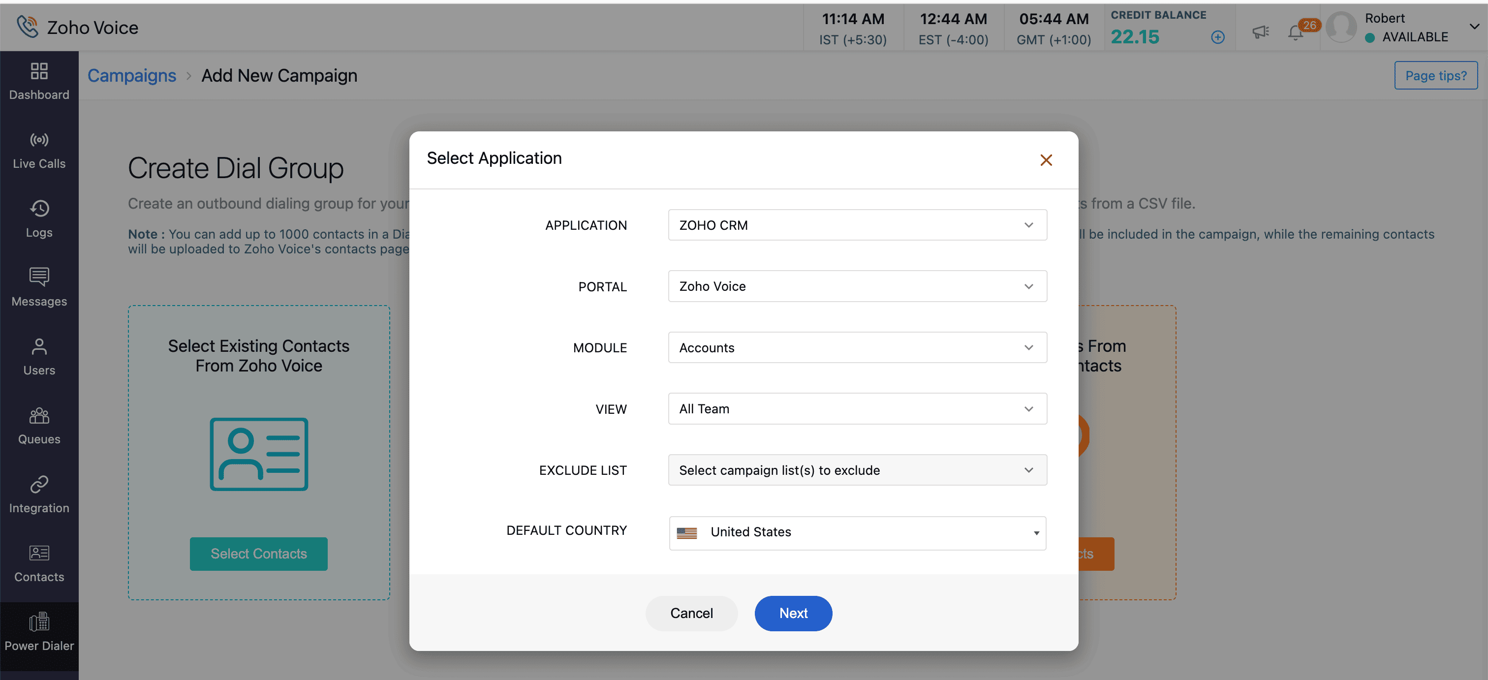 Zoho Voice's Power Dialer helps you to choose contacts from multiple sources for your campaign: