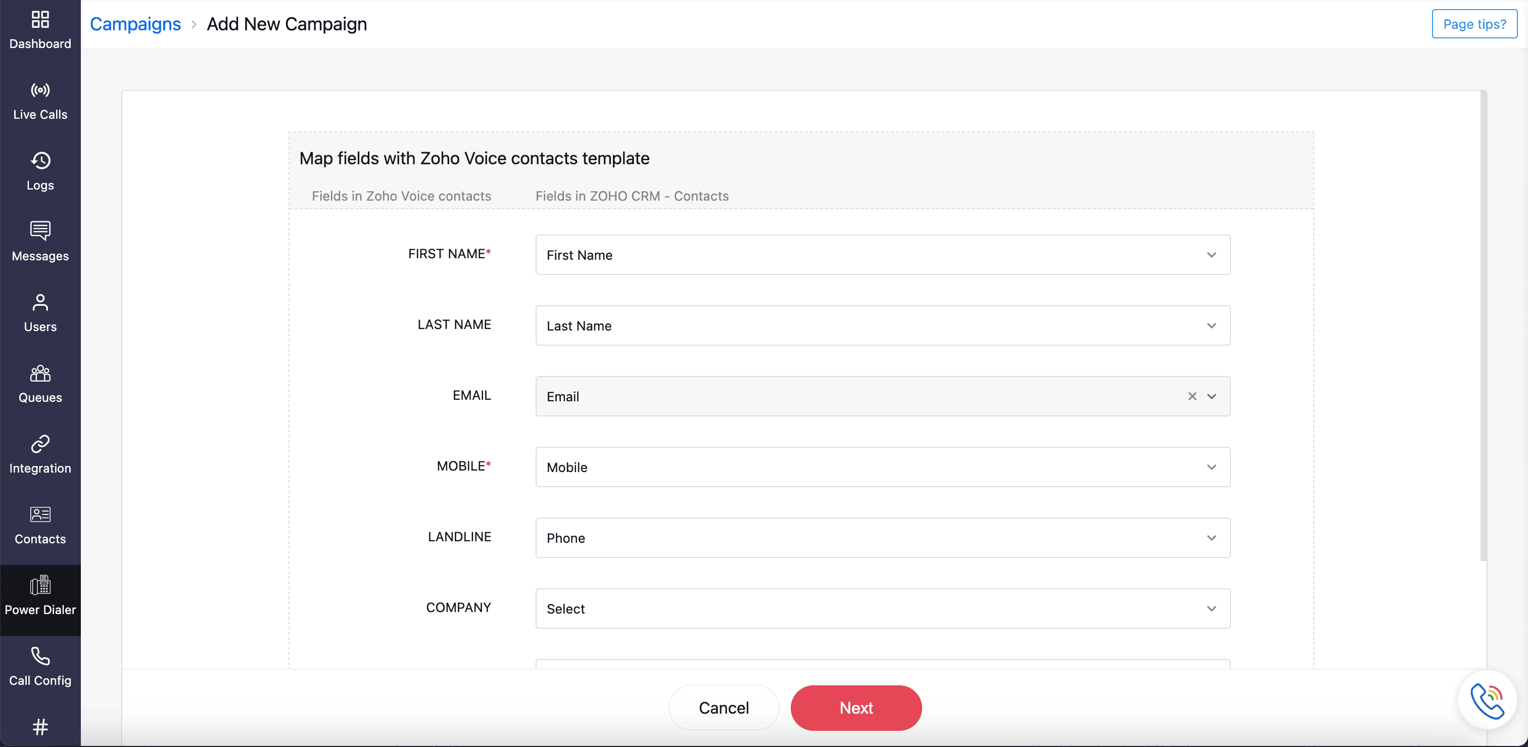Map the contacts from the selected integrated app to the Zoho Voice contacts template, as mentioned in the fields.