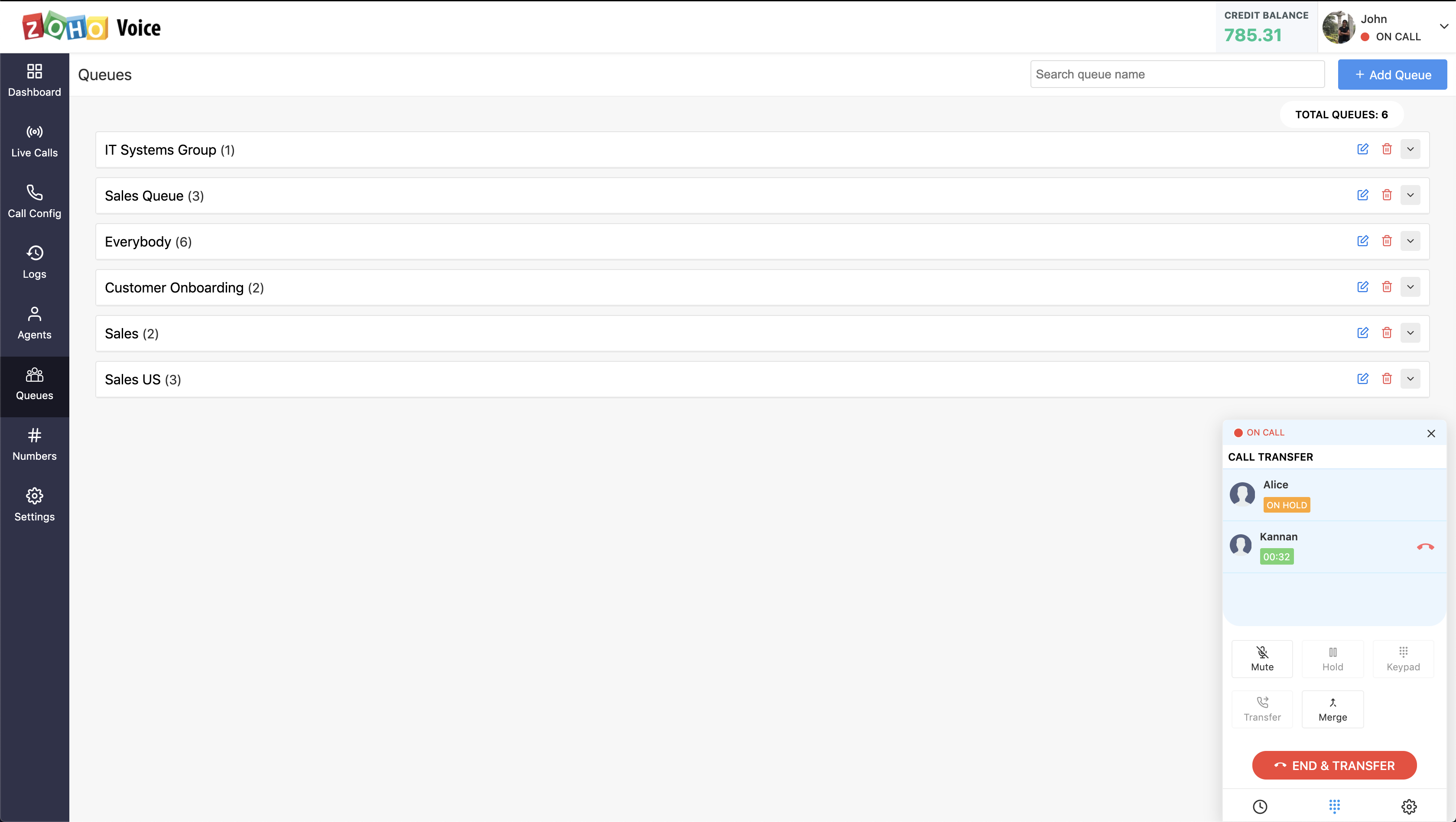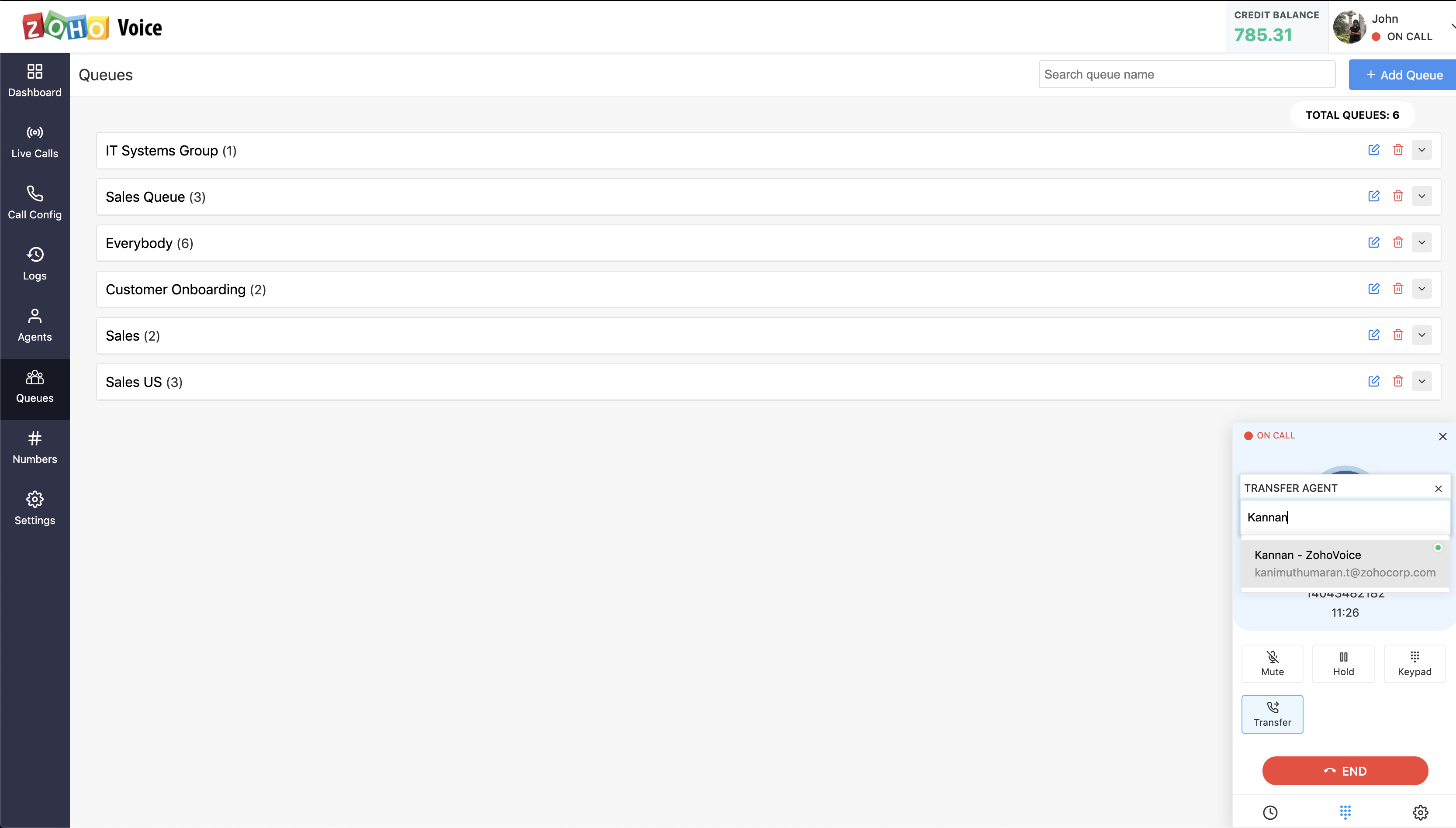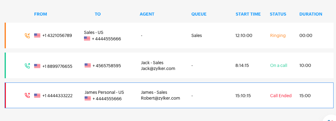 Zoho Voice offers the Queue Performance Metrics to render an effective oversight of the live queue calls and agents' activities in the queue.