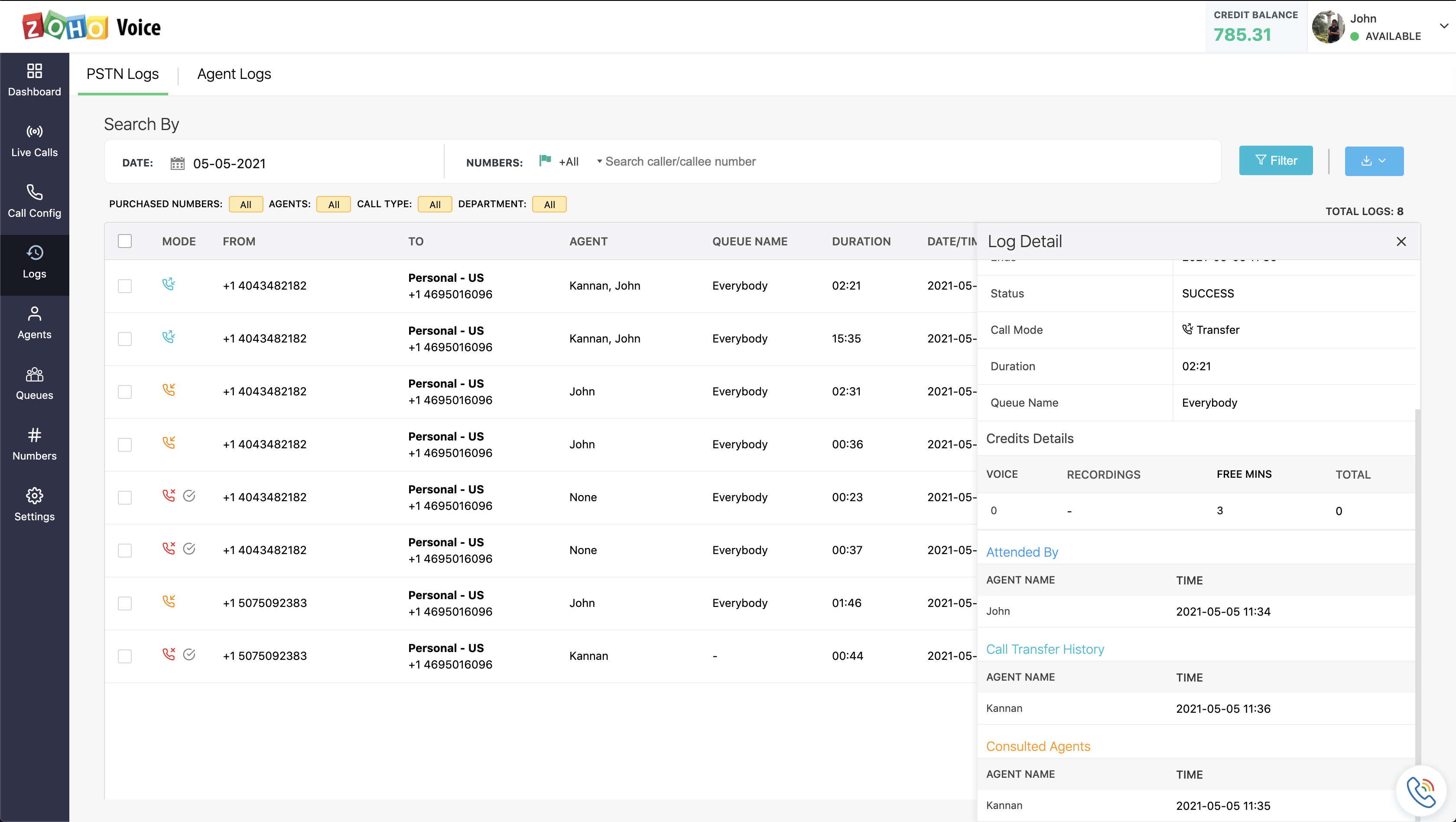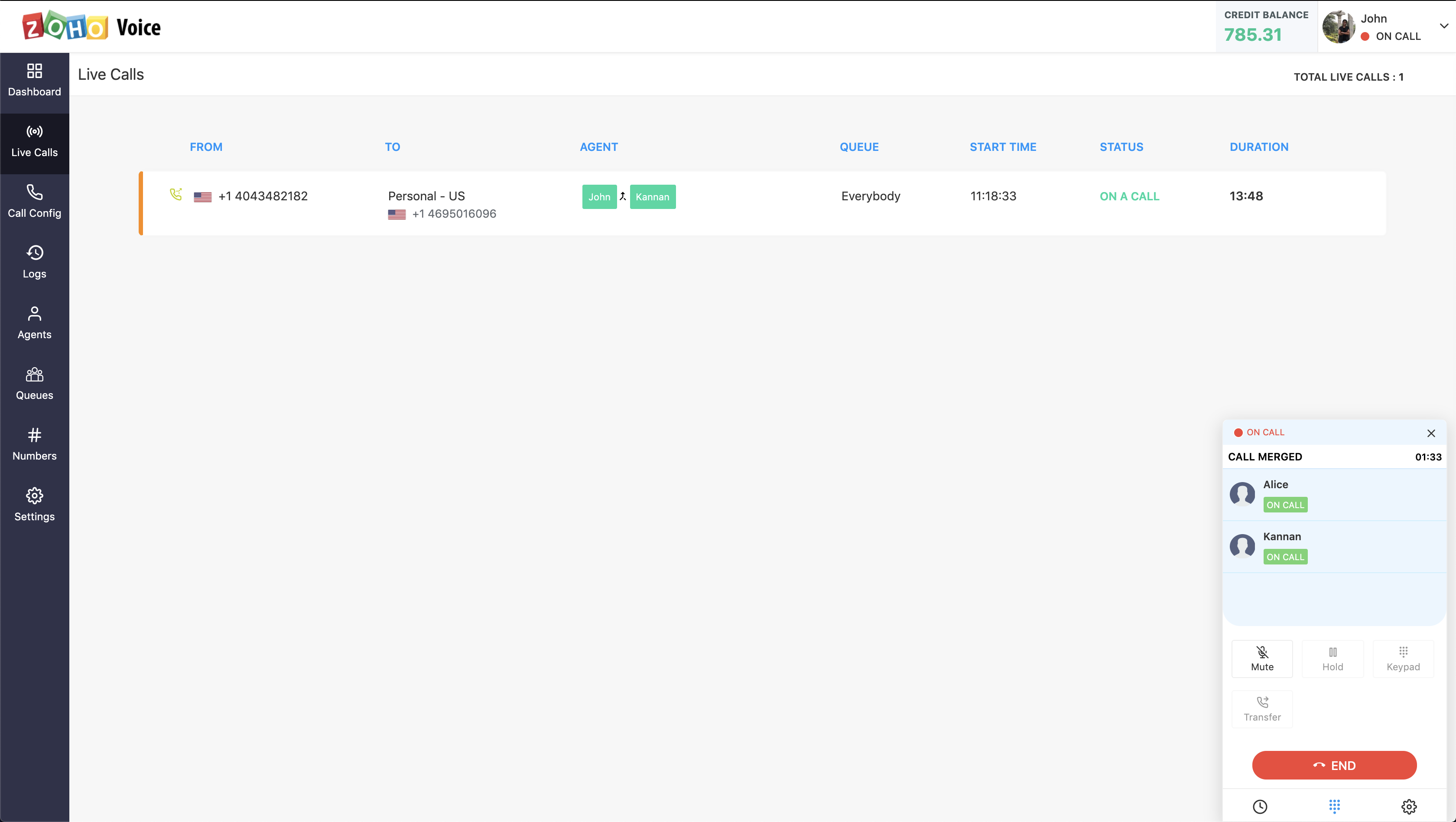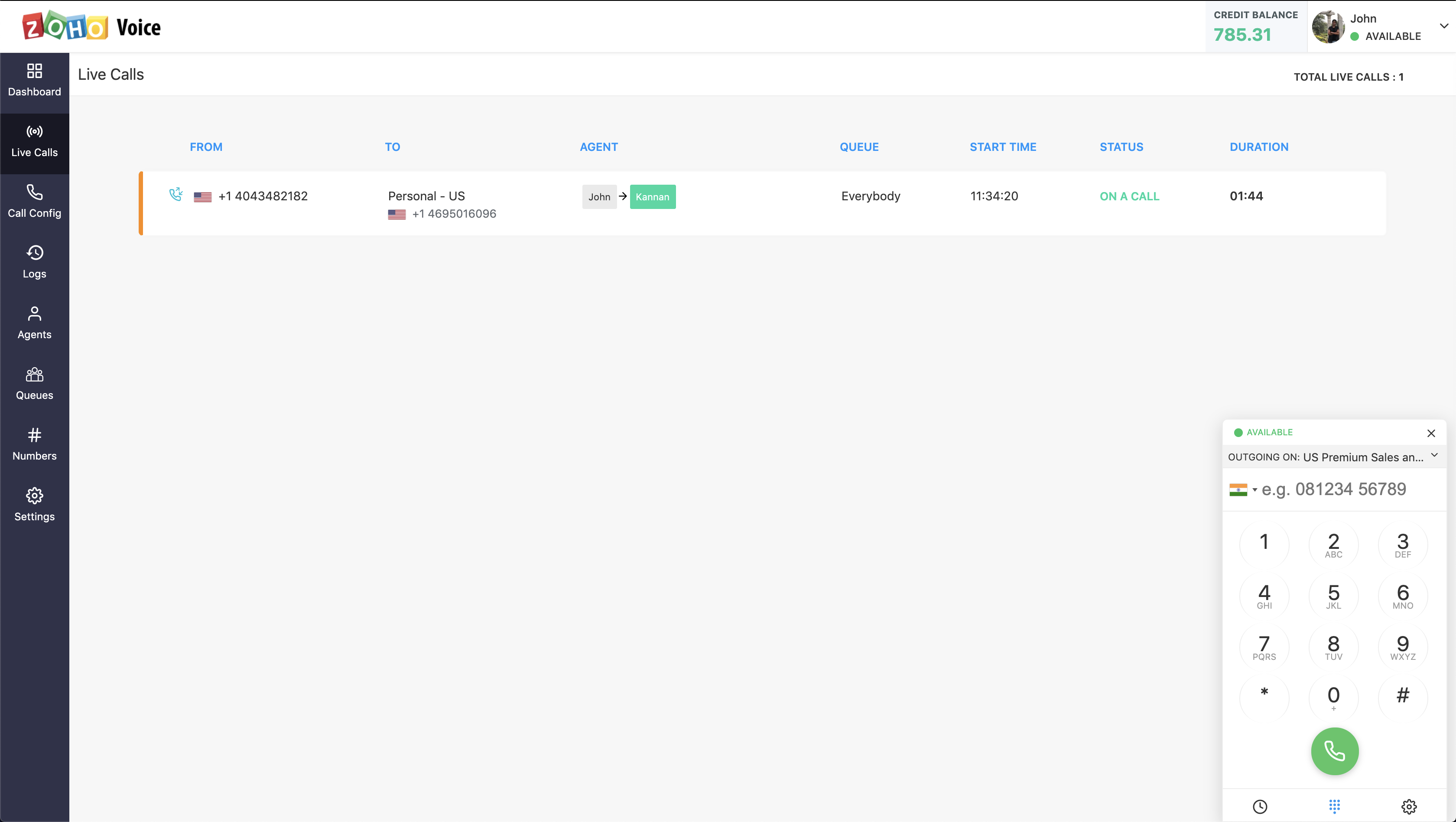Your credit balance is displayed in the top-right corner of the Zoho Voice app. To top up your credit balance: