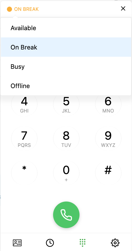 You can manually change your status when you're unavailable to pick calls. This can be done in the Zoho Voice dial pad.