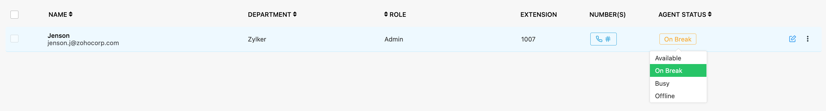 You can mark your status accordingly. When you're on a call, Zoho Voice shows your status as 'On a Call'. This cannot be manually changed.