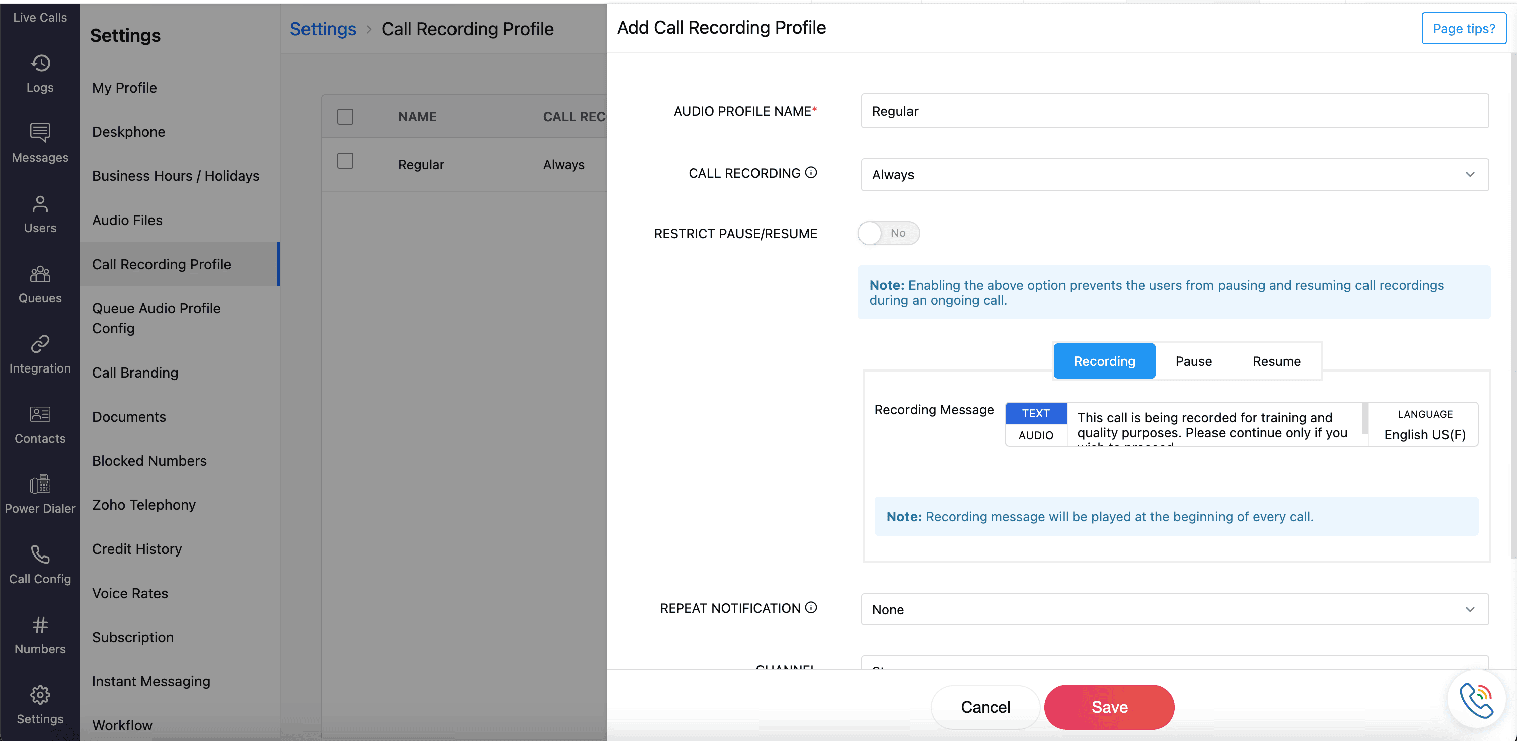 Zoho Voice notifies you of any actions performed and the result of those actions. On clicking the notifications, you will see a pop-up where you can see the configurations or perform any further actions.