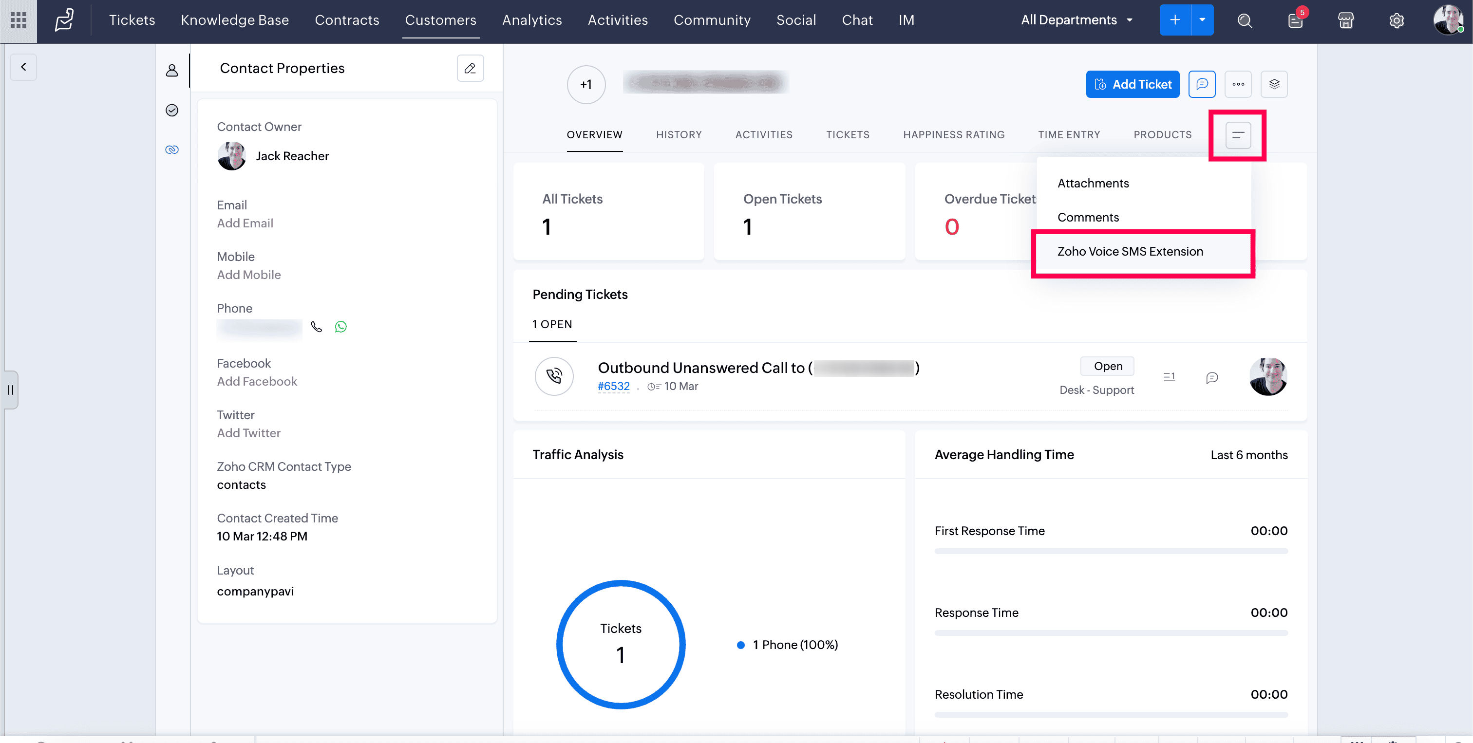 On the contact's detailed view page, click the more menu icon and select Zoho Voice SMS Extension.