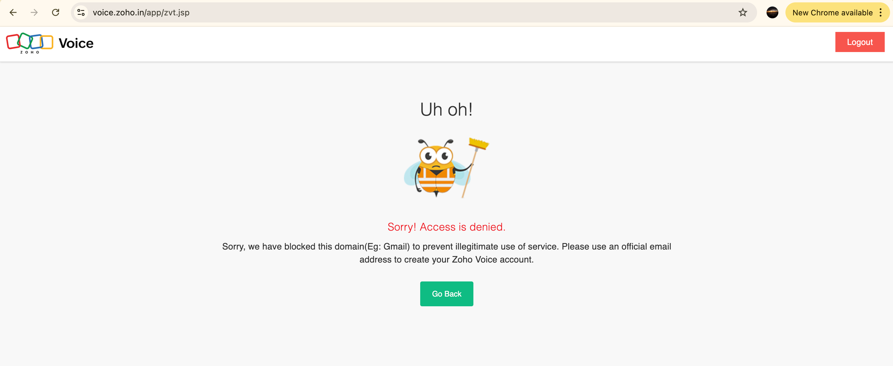 Note: For users encountering an Access denied message like the one shown in the screenshot below, kindly contact our support (support@zohovoice.com).