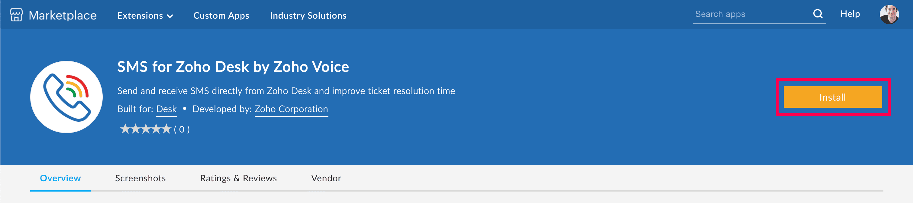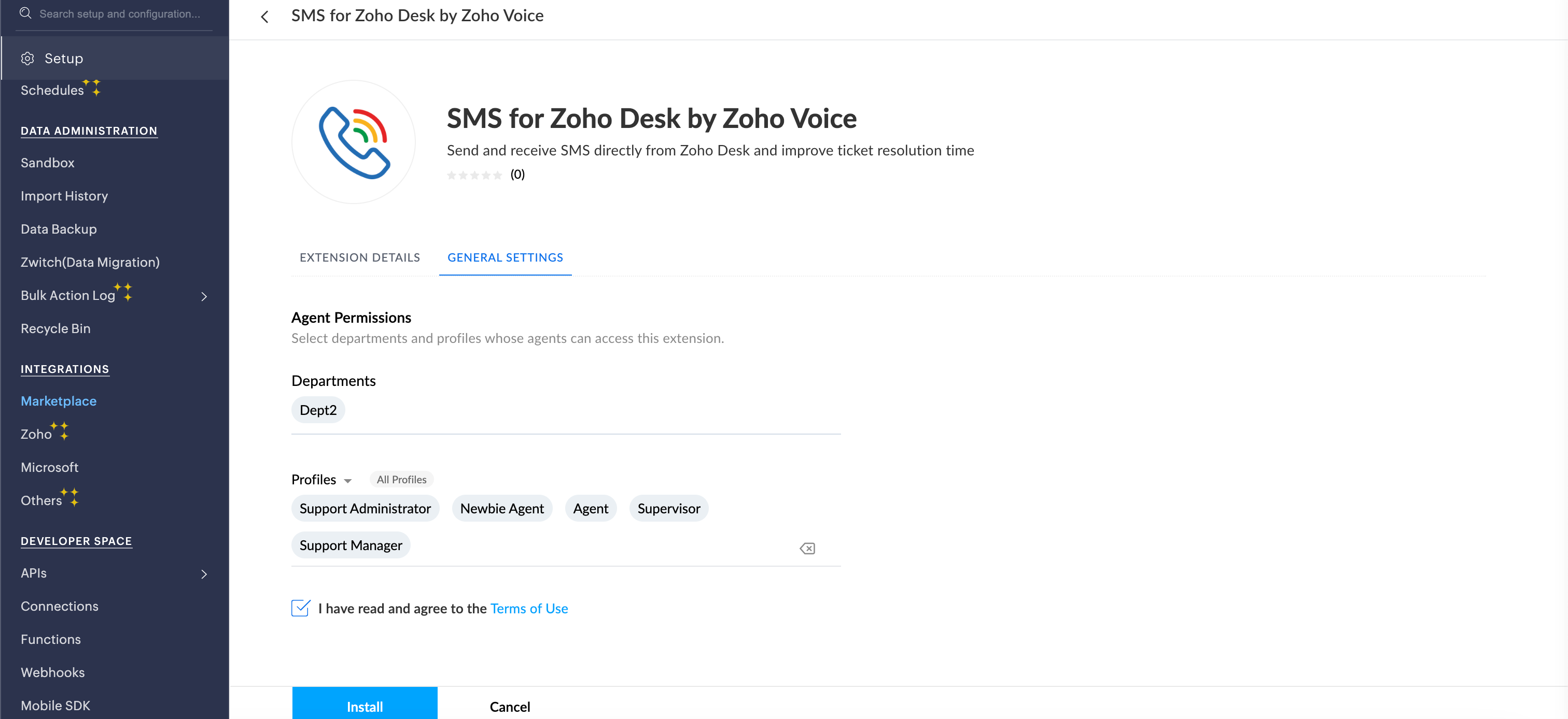 Search for SMS for Zoho Desk by Zoho Voice and click Install.
