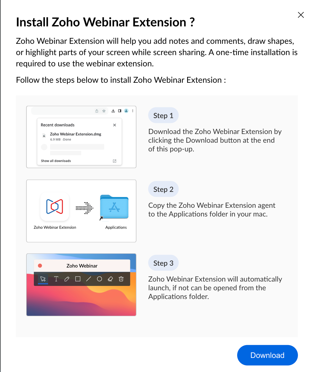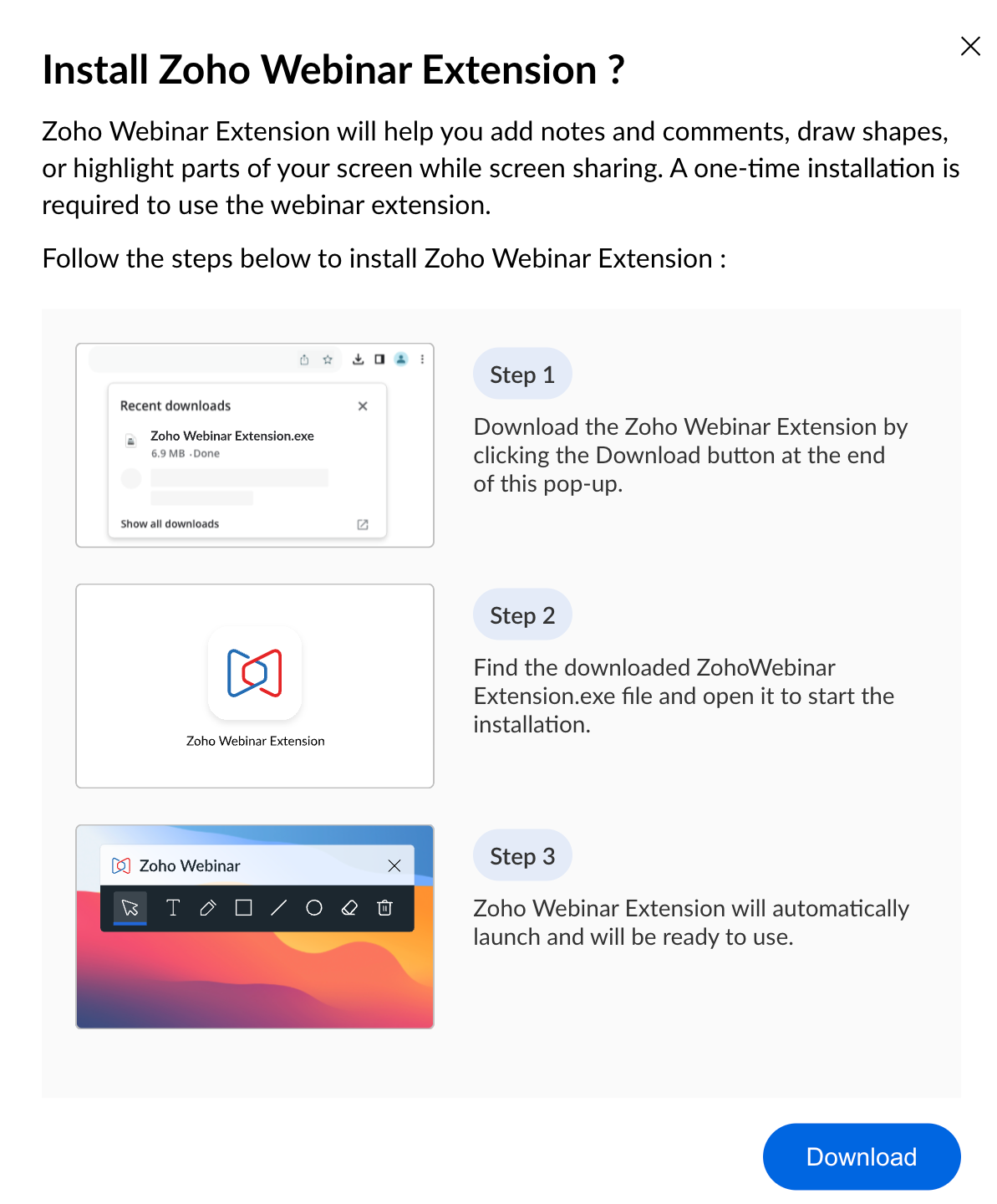 You will be directed to a pop-up to download and install the Zoho Webinar extension.